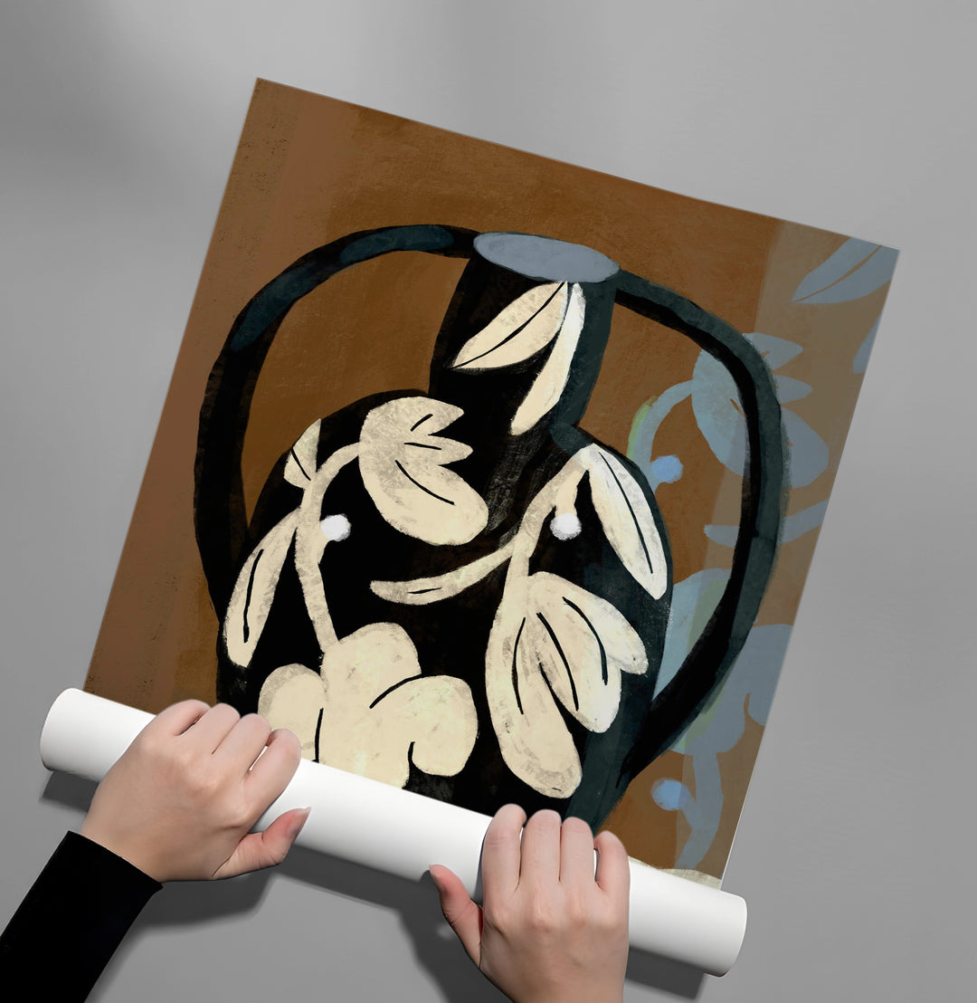 The striking Abstract Black Vase print is a contemporary piece that celebrates organic shapes and bold contrasts. This artwork features a stylized black amphora vase adorned with hand-painted white floral motifs, set against a warm, earthy brown backdrop. This piece brings a touch of rustic chic and artistic sophistication, perfect for creating a worldly, cultured atmosphere in any modern dining area or living space in Dubai.