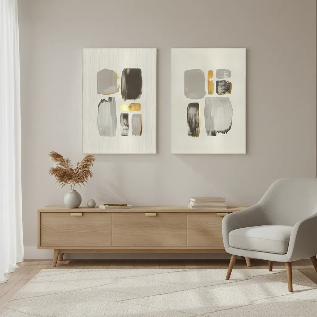 Enhance your modern space with the bold energy of the Abstract Brushstroke Set of 2. These canvases feature powerful, textured strokes, blending gold and deep tones to create a captivating geometric abstract wall art. Perfect for creating a focal point above a sofa or in a modern office, this duo infuses artistic movement and luxury into your decor. Keywords: Abstract Brushstroke Set, Gold Abstract Art, Modern Wall Decor, Two Piece Canvas, Geometric Design.