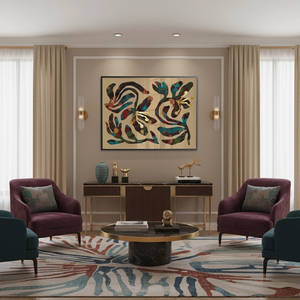 The organic and artistic Abstract Floral print is a contemporary celebration of nature's fluid beauty. This canvas features swirling, colorful abstract botanical shapes in deep teal, burgundy, and earthy tones. These forms are exquisitely highlighted with gleaming metallic gold foil accents, adding a layer of abstract luxury and movement. It serves as a sophisticated focal point for modern residential or commercial spaces in Dubai.