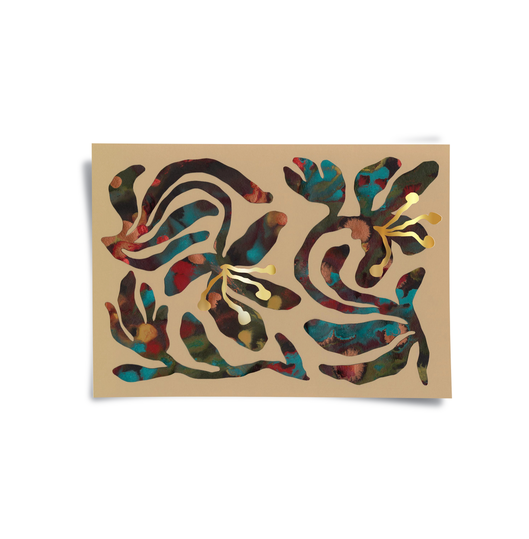 The organic and artistic Abstract Floral print is a contemporary celebration of nature's fluid beauty. This canvas features swirling, colorful abstract botanical shapes in deep teal, burgundy, and earthy tones. These forms are exquisitely highlighted with gleaming metallic gold foil accents, adding a layer of abstract luxury and movement. It serves as a sophisticated focal point for modern residential or commercial spaces in Dubai.