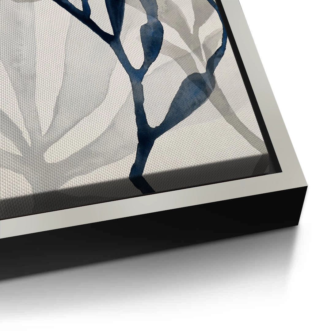 The tranquil Abstract Indigo Seaweed print captures the deep, fluid motions of the ocean floor in a sophisticated watercolor style. This canvas features large, flowing seaweed forms rendered in striking indigo, navy blue, and deep sapphire washes. The composition is layered over softer grey and beige forms, creating a subtle, aquatic depth. This piece is perfect for adding a calm, coastal, and contemporary abstract element to a bathroom, living area, or office in Dubai.