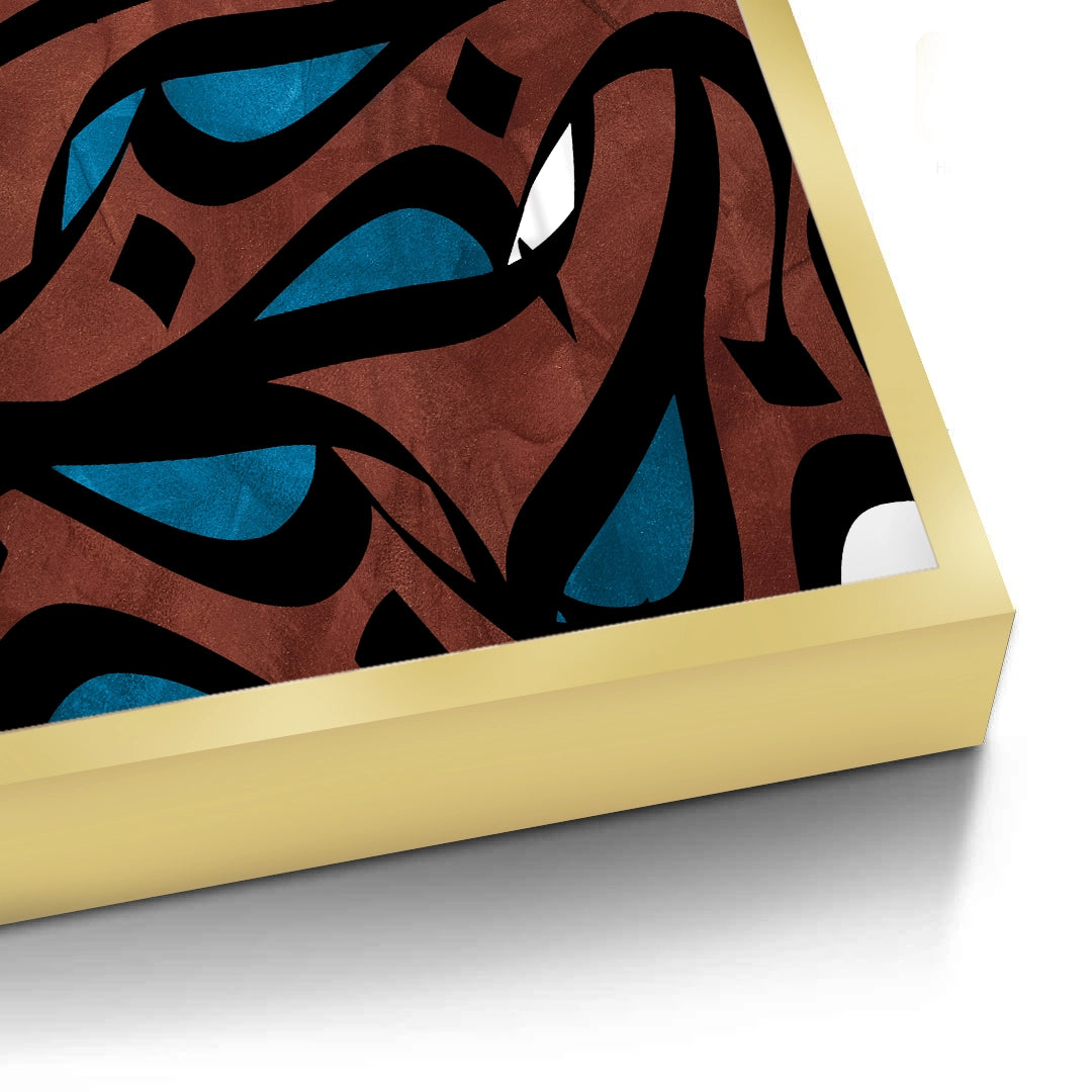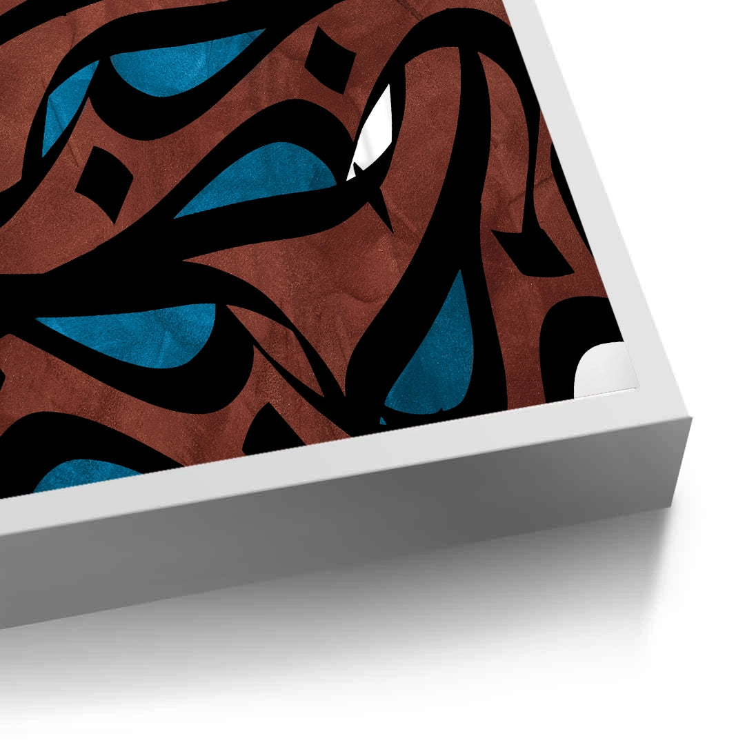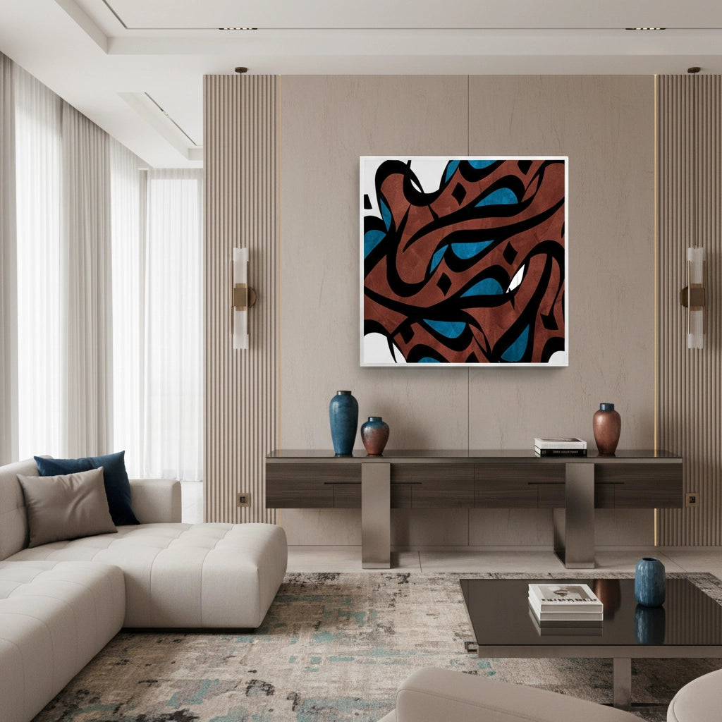 The impactful Abstract Islamic Calligraphy - Earth Tones print offers a rich, contemporary interpretation of Arabic script. This piece features a dense, abstract composition of flowing black calligraphy layered over deep brown/terracotta textures, highlighted with sharp teal blue accents. Its bold colours and complex layering make it a visually stimulating focal point. Ideal for adding a modern, warm, and artistically significant piece to a study, living room, or reception area in Dubai.