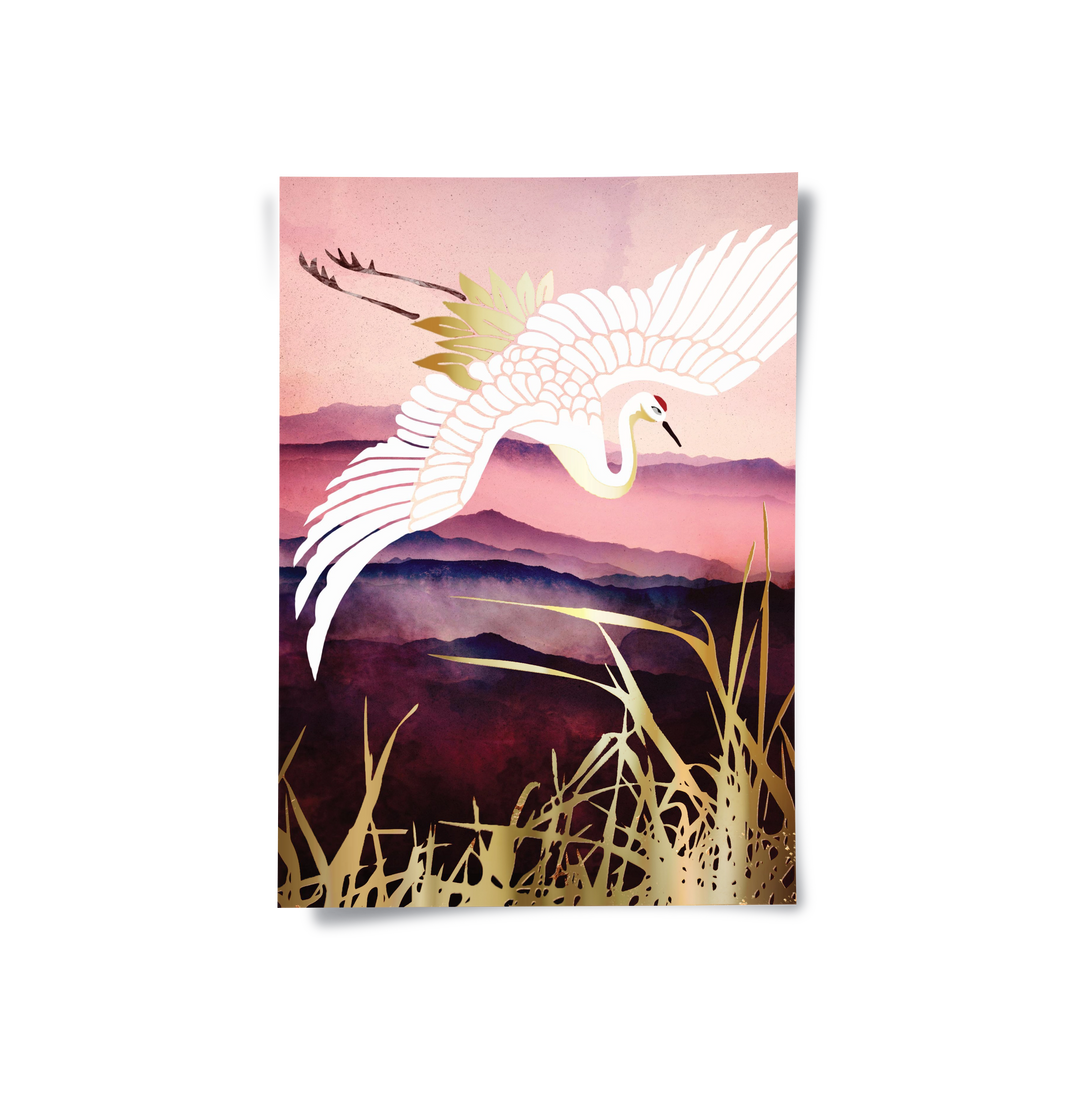 The mesmerizing Abstract Japanese Crane print is an exquisite piece of Oriental abstract art and gilded luxury. This canvas features a beautiful white crane soaring above a rich, layered landscape of deep magenta and plum mountains. The crane is accented with shimmering metallic gold foil detailing on its feathers and head. With dynamic gold foil reeds in the foreground, this artwork is a stunning focal point, symbolizing peace and good fortune, perfect for sophisticated interiors in Dubai.