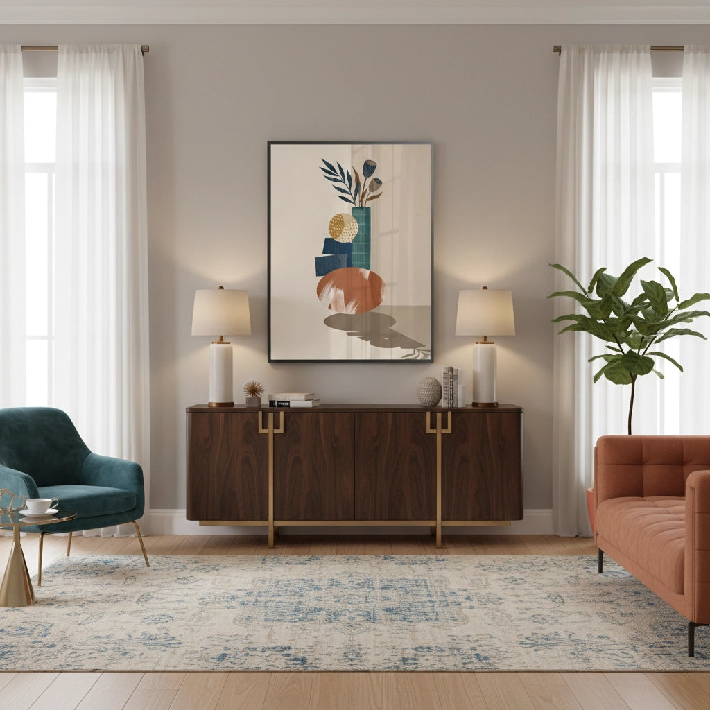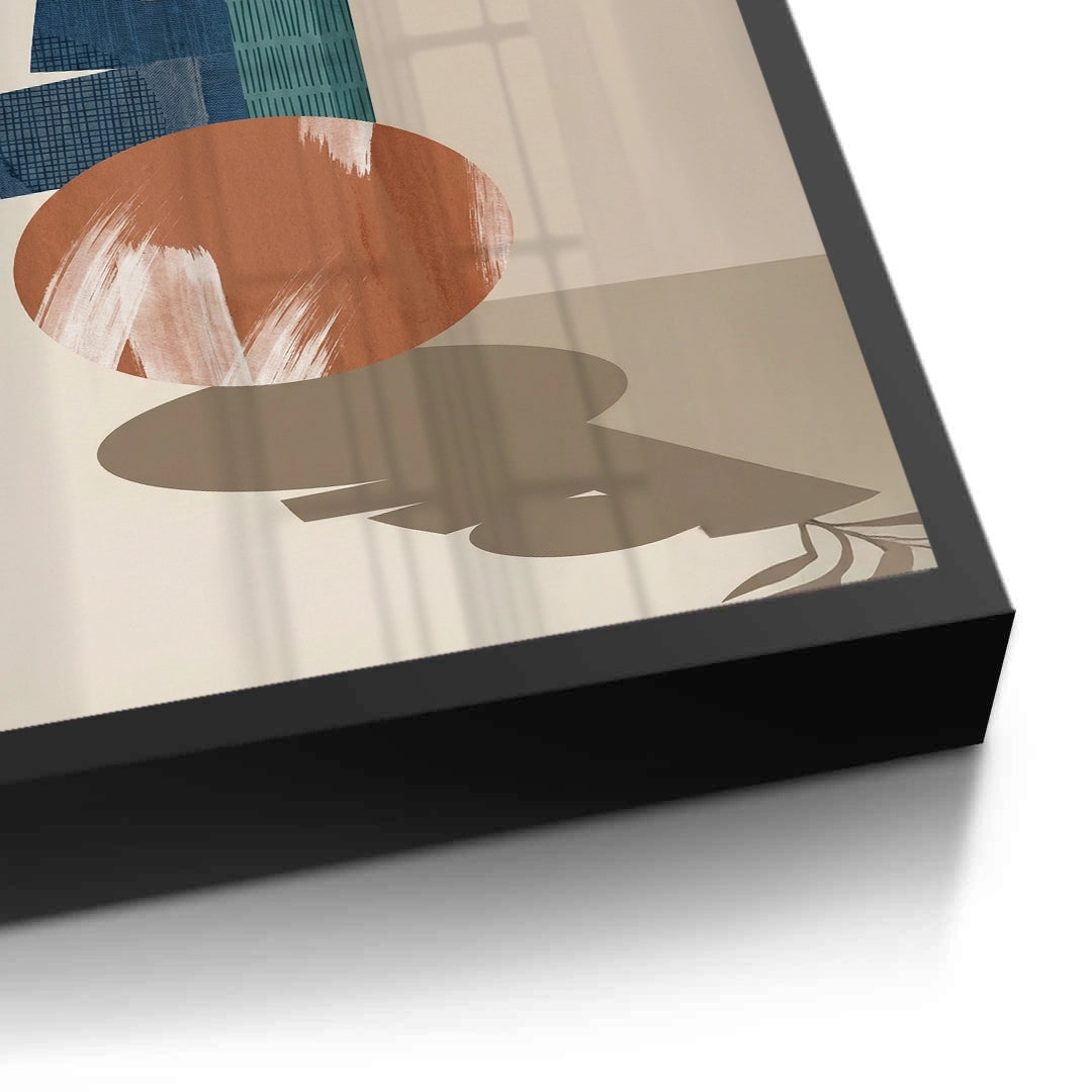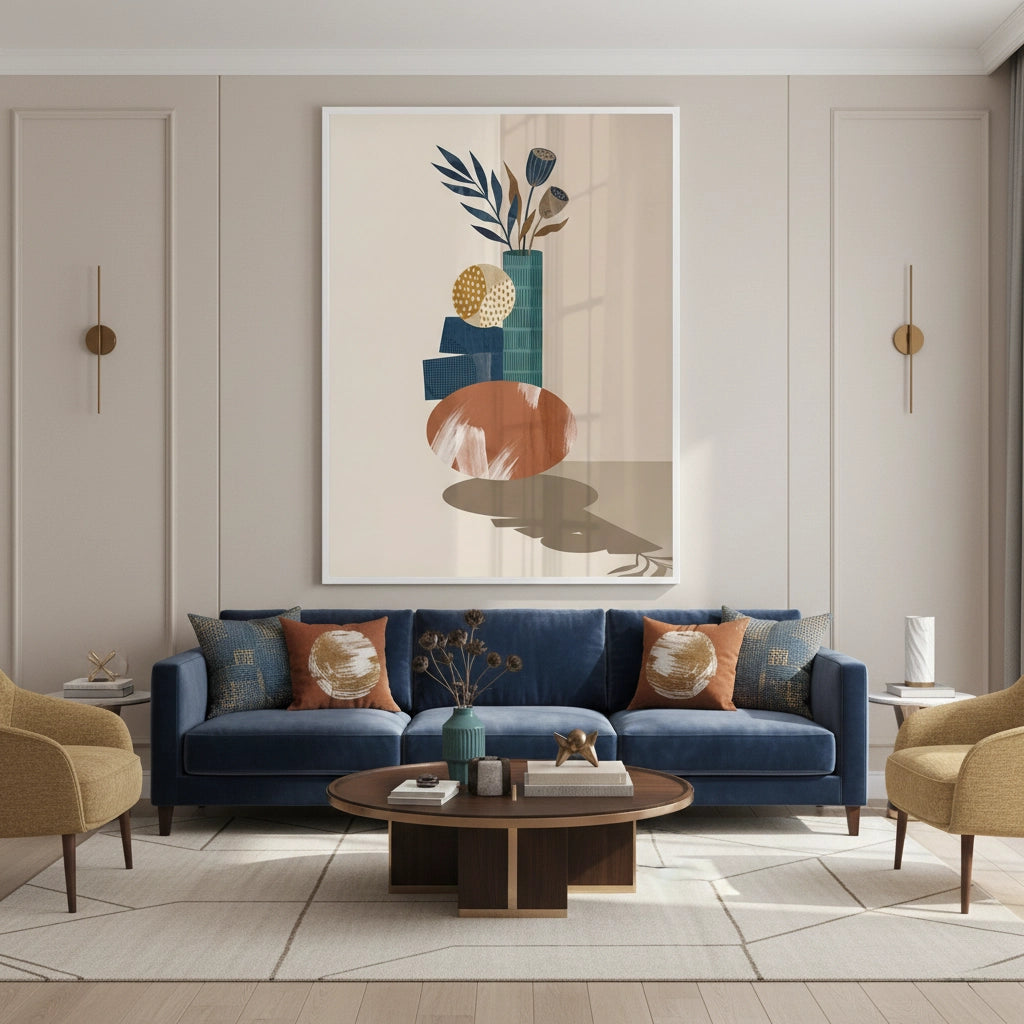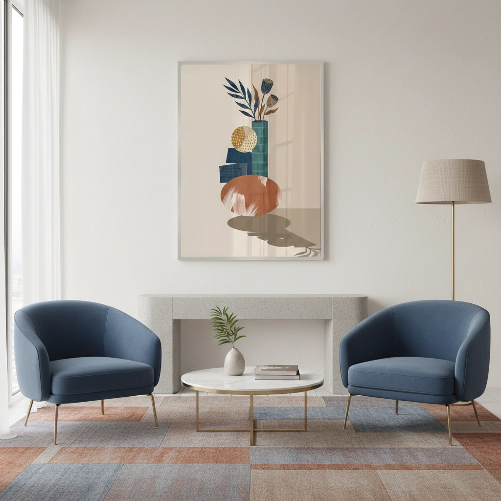 Elevate your decor with the Abstract Vase and Dried Flowers from Jasmine Art’s Bohemian series. This sophisticated still-life features a unique blend of organic shapes, geometric patterns, and dried botanical elements in rich terracotta and teal tones. The artistic use of shadows and layered textures creates a remarkable sense of depth and modern elegance. Finished with our signature premium vertical texture, this print offers a high-end tactile experience and luxury gallery finish. An ideal statement piece for a contemporary dining area, a chic office, or a modern hallway in Dubai.