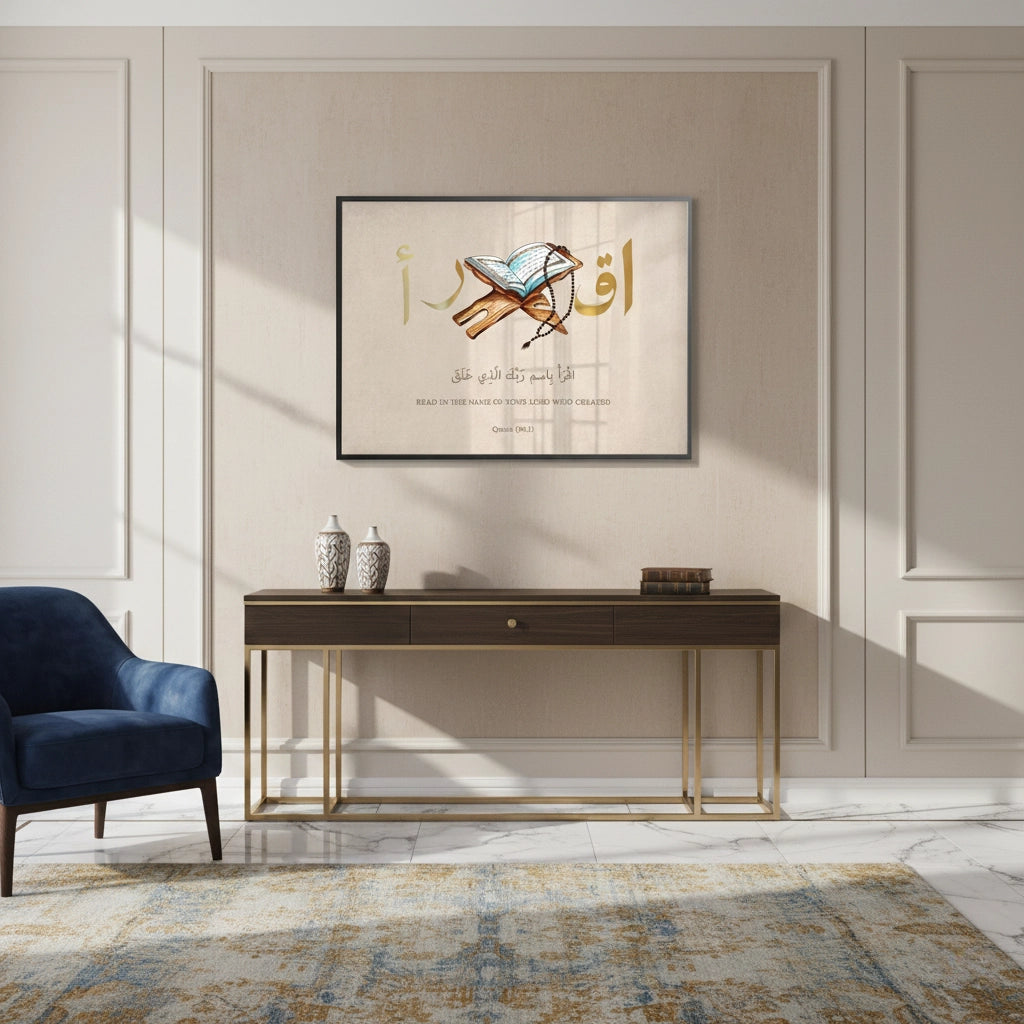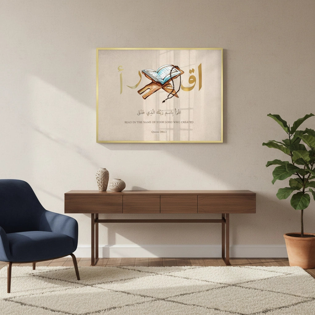 Honor the first command of the Holy Quran with the Iqra (Read) art print from Jasmine Art. This detailed piece features the powerful command in bold metallic gold Arabic script, centered around a beautiful hand-drawn illustration of the Holy Quran on a Rehal. Including the full verse from Surah Al-Alaq (96:1) in both Arabic and English, this artwork serves as a daily reminder of the importance of knowledge and faith. Finished with our signature premium vertical texture, it provides a luxurious tactile finish. A perfect spiritual addition to a study room, library, or a modern family home in Dubai.