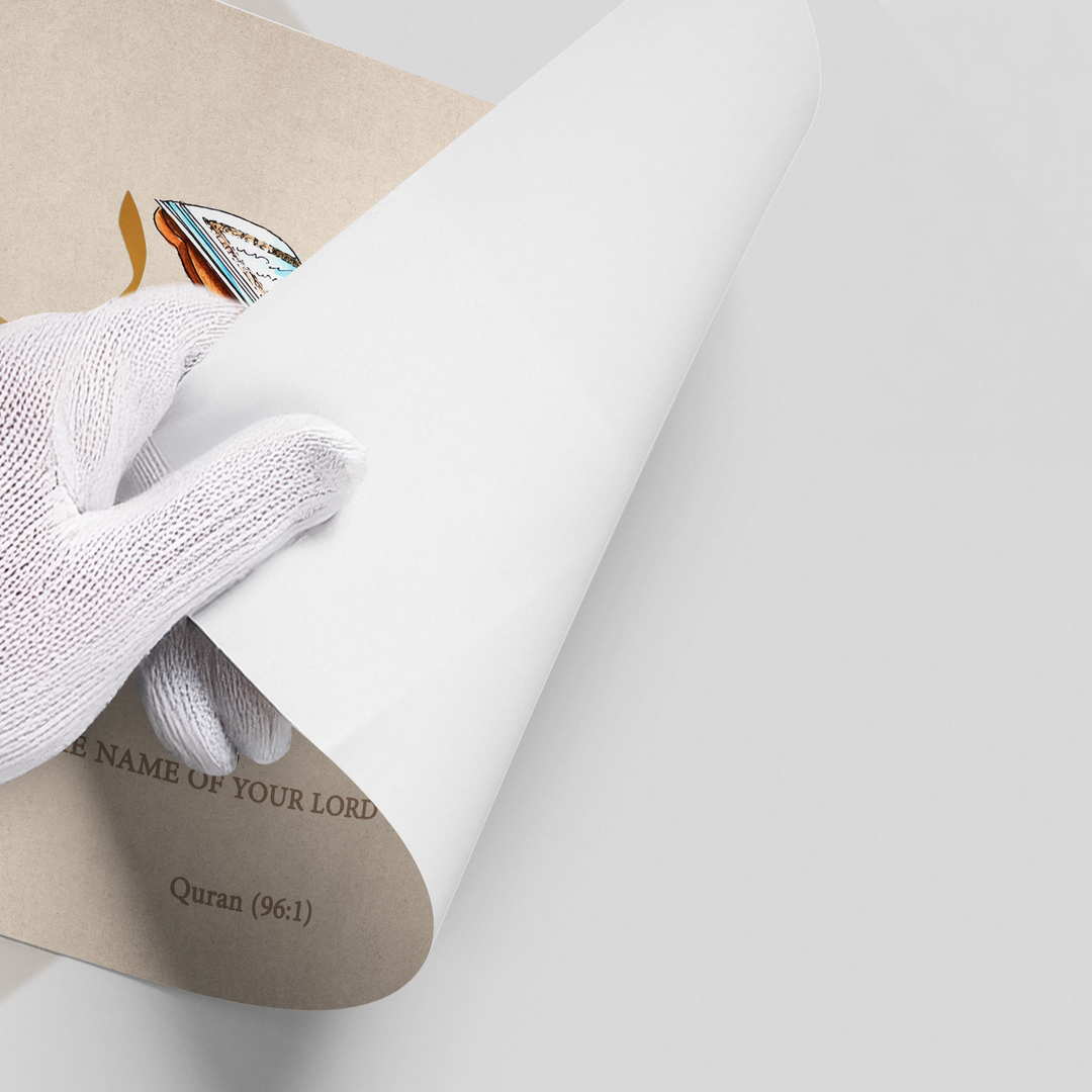 Honor the first command of the Holy Quran with the Iqra (Read) art print from Jasmine Art. This detailed piece features the powerful command in bold metallic gold Arabic script, centered around a beautiful hand-drawn illustration of the Holy Quran on a Rehal. Including the full verse from Surah Al-Alaq (96:1) in both Arabic and English, this artwork serves as a daily reminder of the importance of knowledge and faith. Finished with our signature premium vertical texture, it provides a luxurious tactile finish. A perfect spiritual addition to a study room, library, or a modern family home in Dubai.