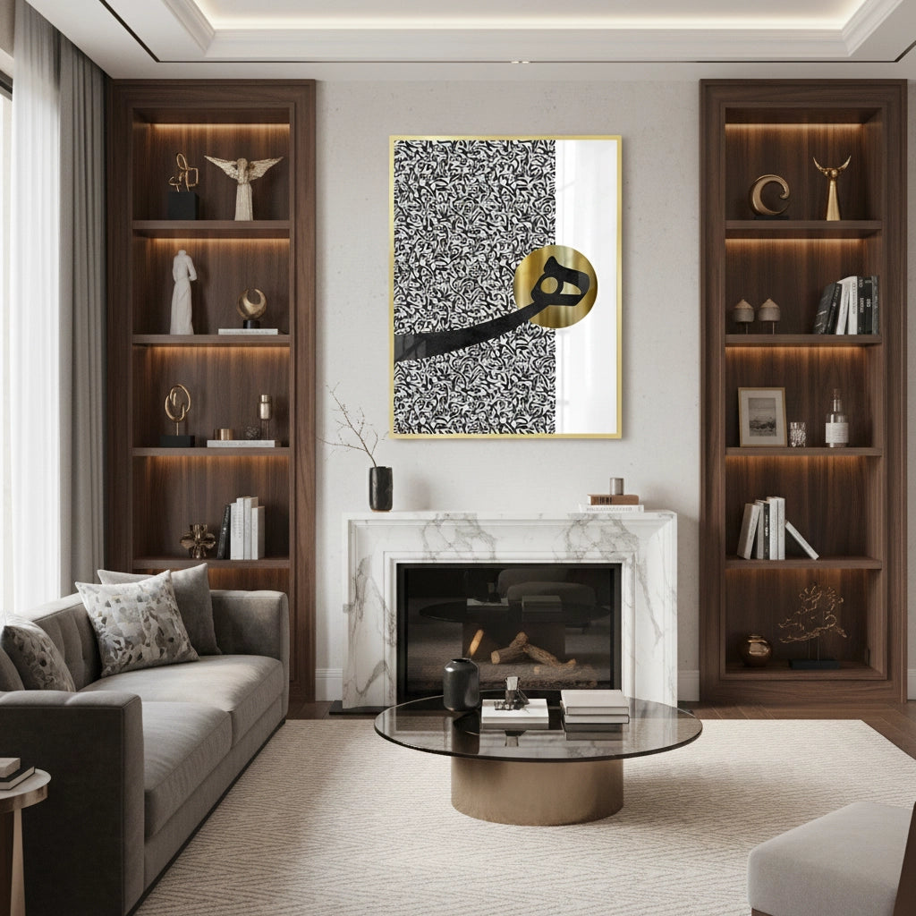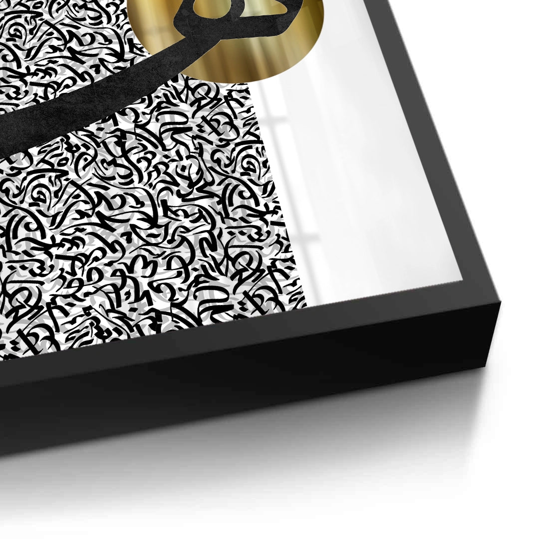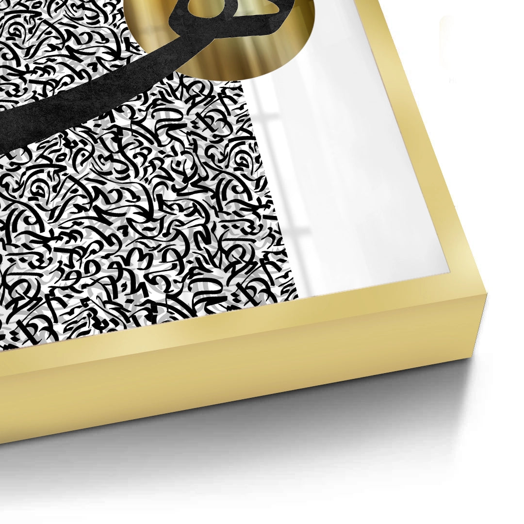 The minimalist Al-Hā in Abstract - Golden Fluidity print captures the essence of foundational Arabic letters in a modern, elegant form. Fluid, highly reflective metallic gold calligraphy, centered around the letter Hā (ه) or Nūn (ن), flows dynamically across the canvas. The script is contrasted beautifully by a simple, geometric background of beige, olive-green, and brown square blocks. This artwork is a study in clean lines, spiritual form, and metallic luxury. Ideal for adding a contemporary, sophisticated, and reflective accent to a modern office or apartment in Dubai.