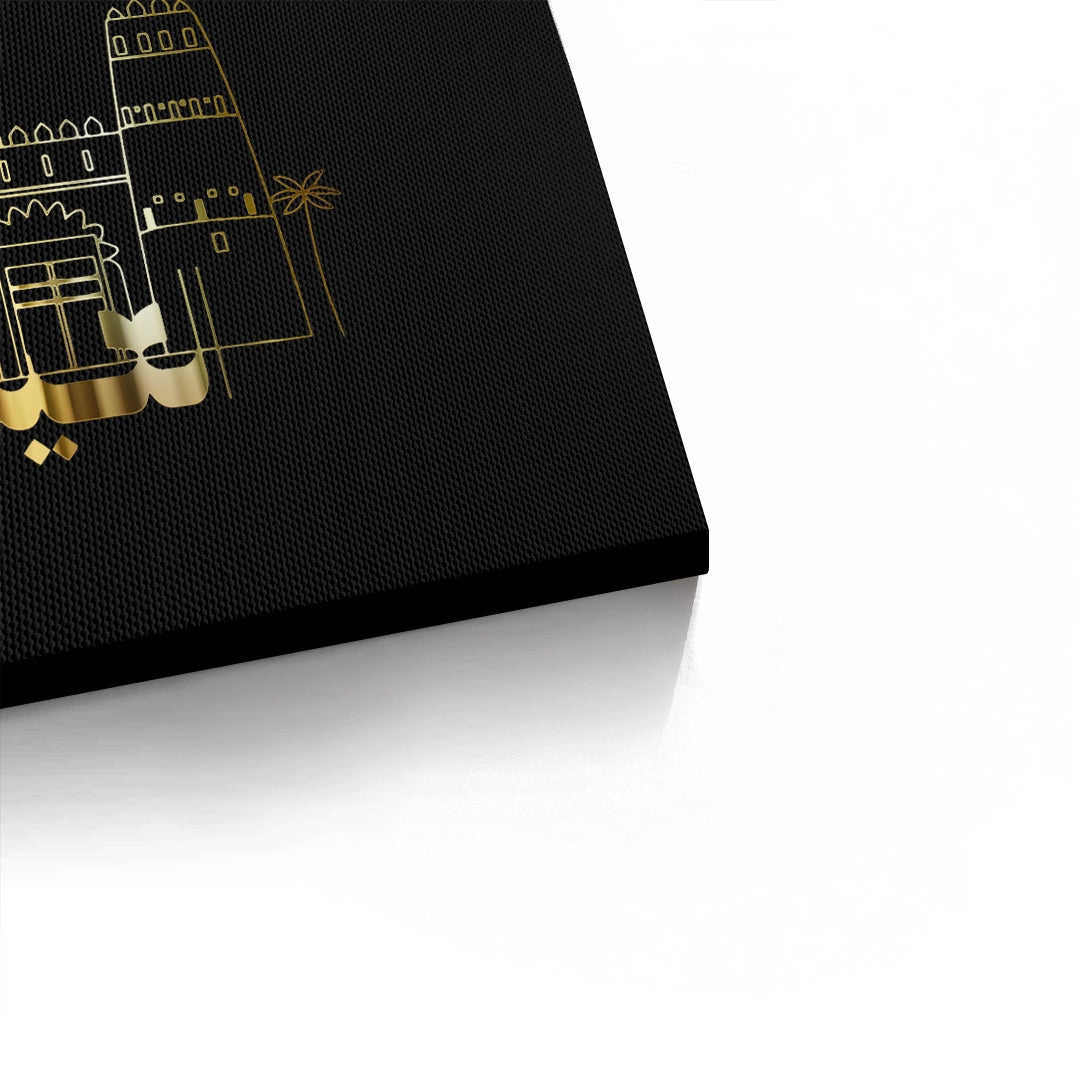 Celebrate the historic heart of Al Ain with the Al Jahili Fort - Golden Heritage Line Art print. This exquisite piece features a refined gold line illustration of the fort’s iconic defensive towers and ornate architecture. Flanked by minimalist gold palm trees and anchored by bold Arabic calligraphy for "Al Ain", the design radiates luxury against a deep black, textured canvas. A perfect blend of modern minimalism and Emirati tradition, this artwork is a sophisticated choice for a formal majlis, a gallery wall, or a premium office space in Dubai or Al Ain.