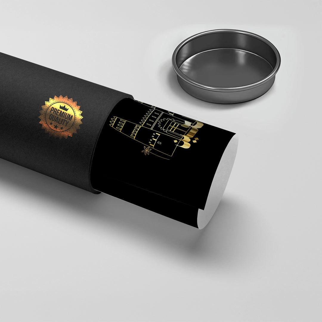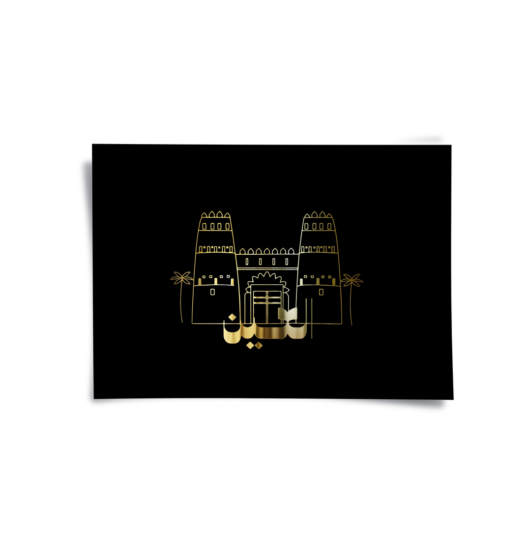 Celebrate the historic heart of Al Ain with the Al Jahili Fort - Golden Heritage Line Art print. This exquisite piece features a refined gold line illustration of the fort’s iconic defensive towers and ornate architecture. Flanked by minimalist gold palm trees and anchored by bold Arabic calligraphy for "Al Ain", the design radiates luxury against a deep black, textured canvas. A perfect blend of modern minimalism and Emirati tradition, this artwork is a sophisticated choice for a formal majlis, a gallery wall, or a premium office space in Dubai or Al Ain.