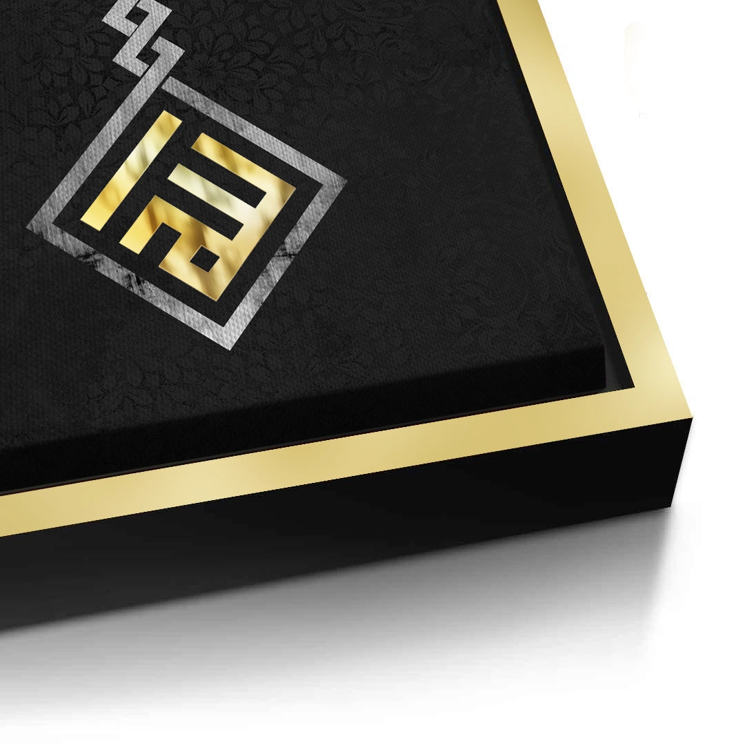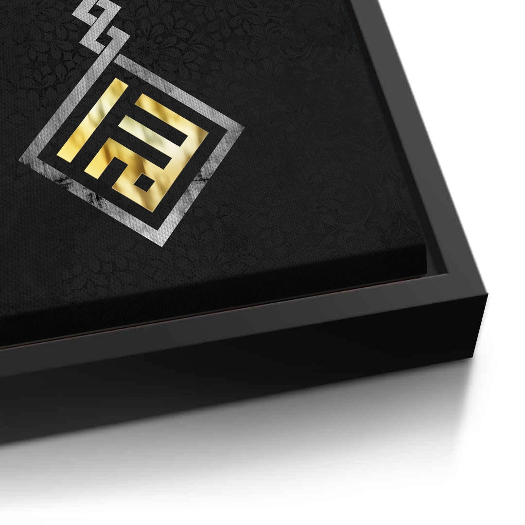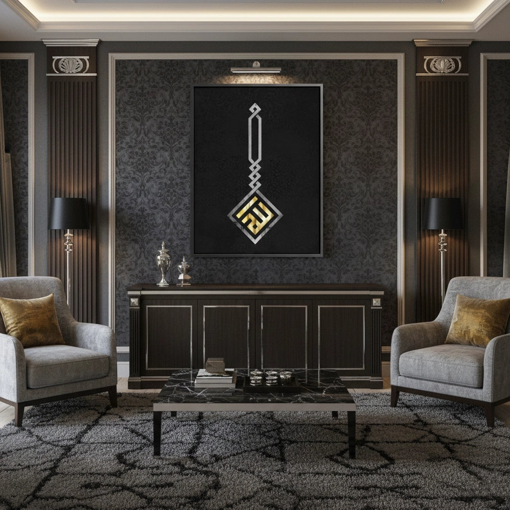 Define your space with the Pillar of Faith from Jasmine Art’s Arabic Calligraphy collection. This striking masterpiece transforms the letter "Alif" into a majestic architectural emblem, featuring intricate silver knots and a radiant gold foundation. Set against a deep, charcoal black backdrop with an elegant damask pattern, it symbolizes unity and strength. Finished with our signature premium damask-embossed texture, this print offers exceptional tactile depth and a high-end gallery finish. A prestigious centerpiece for a corporate boardroom, a modern foyer, or an executive office in Dubai.
