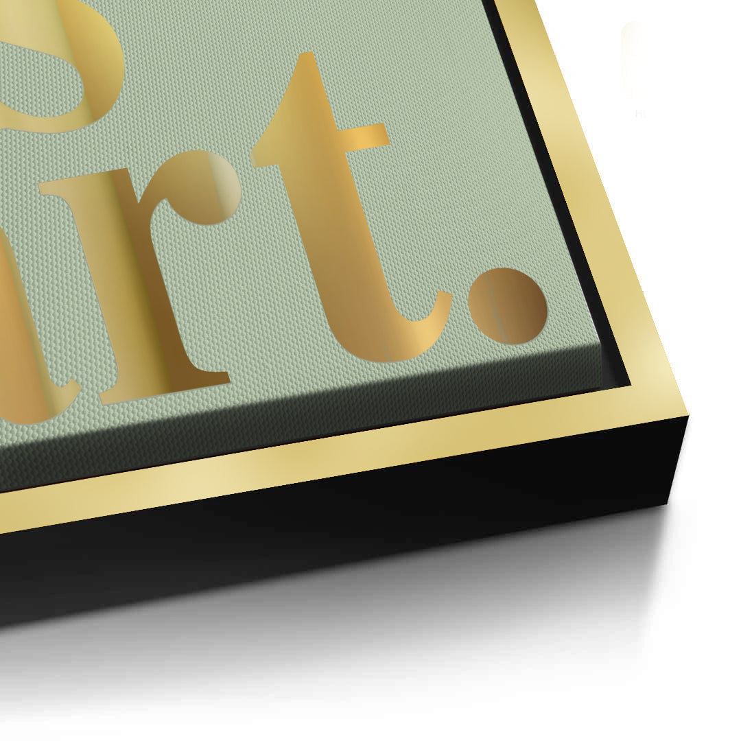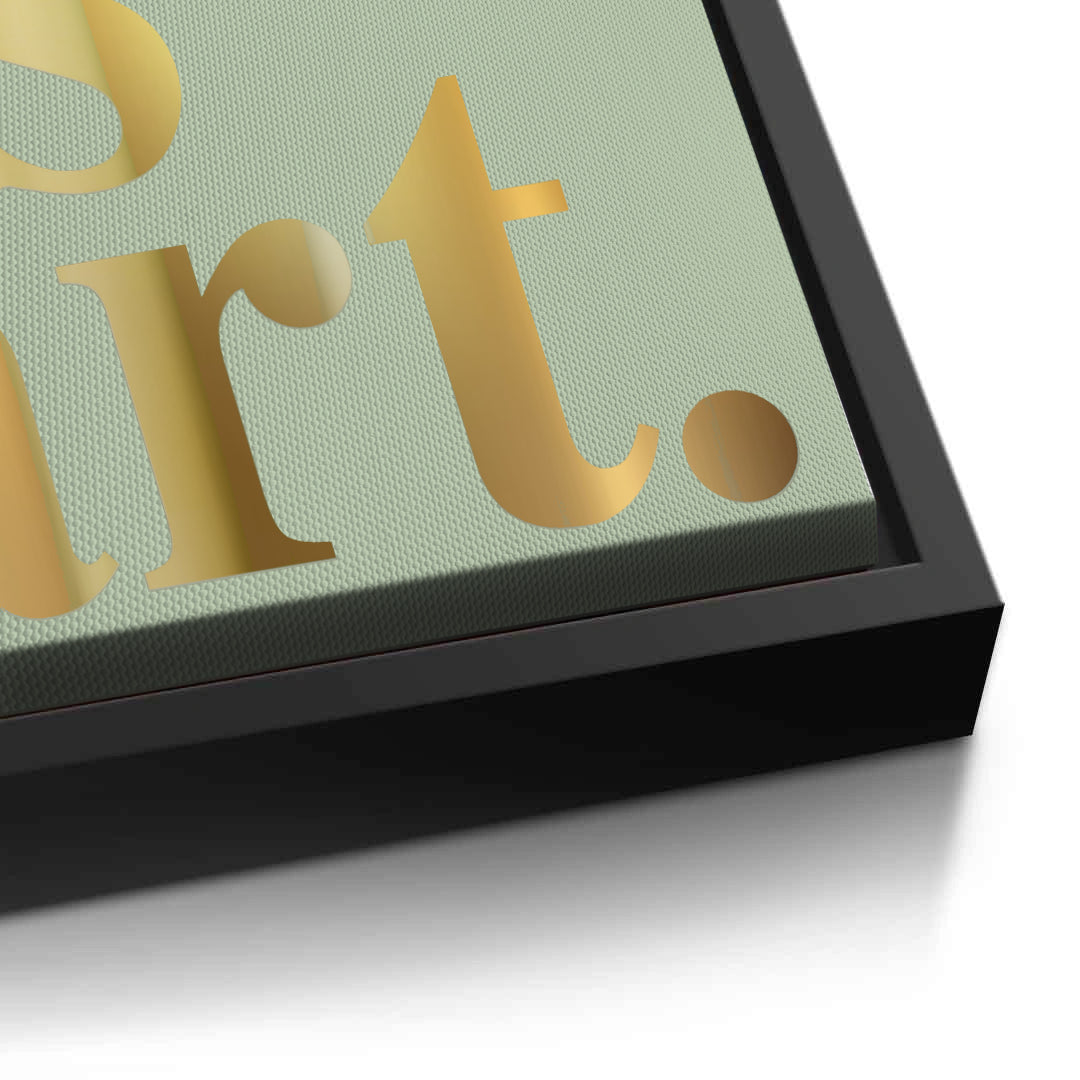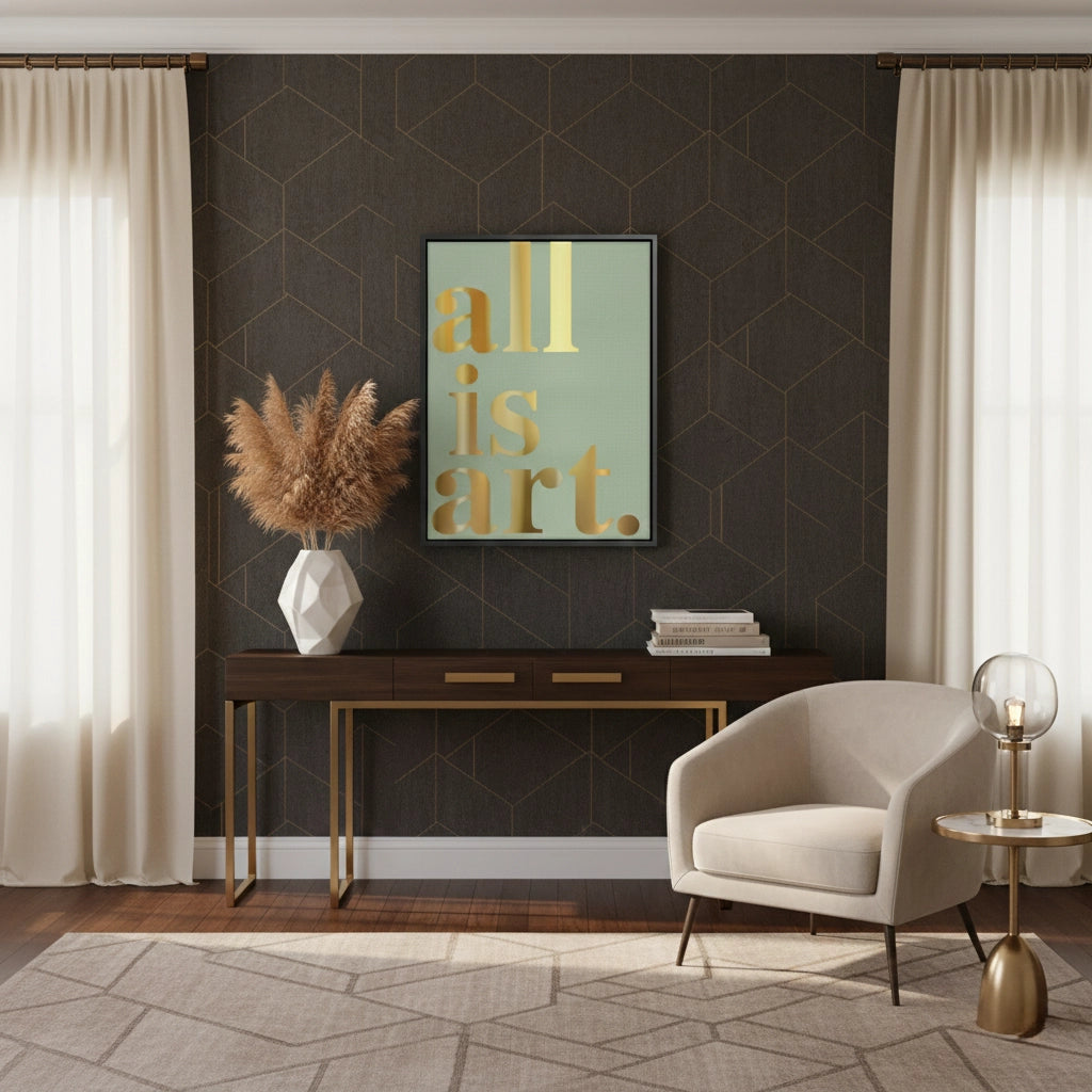 The refined All is Art - Gold Statement on Sage Canvas print is a philosophical and elegant piece for the modern creative. The profound statement "All is art." is beautifully presented in large, vertically stacked metallic gold Serif typography. The luminous gold text provides a luxurious contrast against the soft, muted sage green, textured pinstripe canvas, offering a calm and chic aesthetic. This artwork is perfect for adding an inspirational, minimalist, and sophisticated focal point to a home studio, creative workspace, or a modern living room in Dubai.