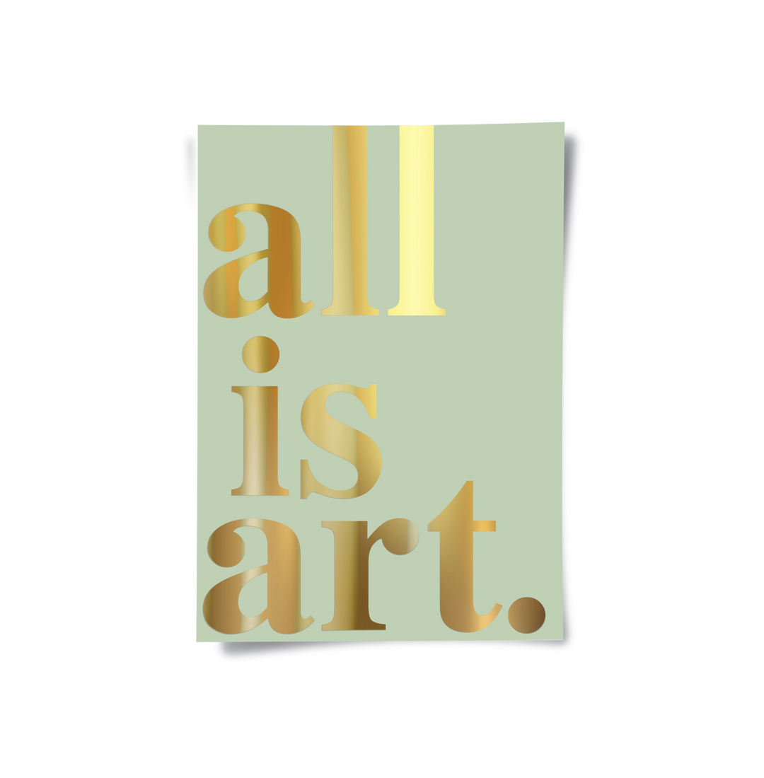 The refined All is Art - Gold Statement on Sage Canvas print is a philosophical and elegant piece for the modern creative. The profound statement "All is art." is beautifully presented in large, vertically stacked metallic gold Serif typography. The luminous gold text provides a luxurious contrast against the soft, muted sage green, textured pinstripe canvas, offering a calm and chic aesthetic. This artwork is perfect for adding an inspirational, minimalist, and sophisticated focal point to a home studio, creative workspace, or a modern living room in Dubai.