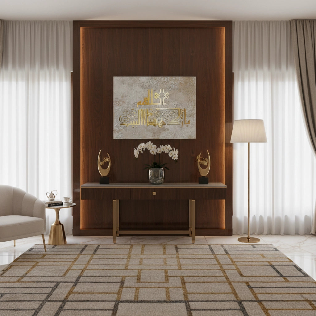 Invite divine grace into your home with the House of Blessings masterpiece from Jasmine Art’s Arabic Calligraphy collection. This elegant artwork features the prayer "Allahumma Barik Hadha al-Bayt" in radiant metallic gold script, accented with intricate Arabesque floral motifs and a central geometric knot. Set against a champagne beige backdrop with our signature premium damask-grain texture, this print offers exceptional tactile depth and a luxury gallery finish. An ideal spiritual anchor for a main entrance, a formal Majlis, or a family living room in Dubai.