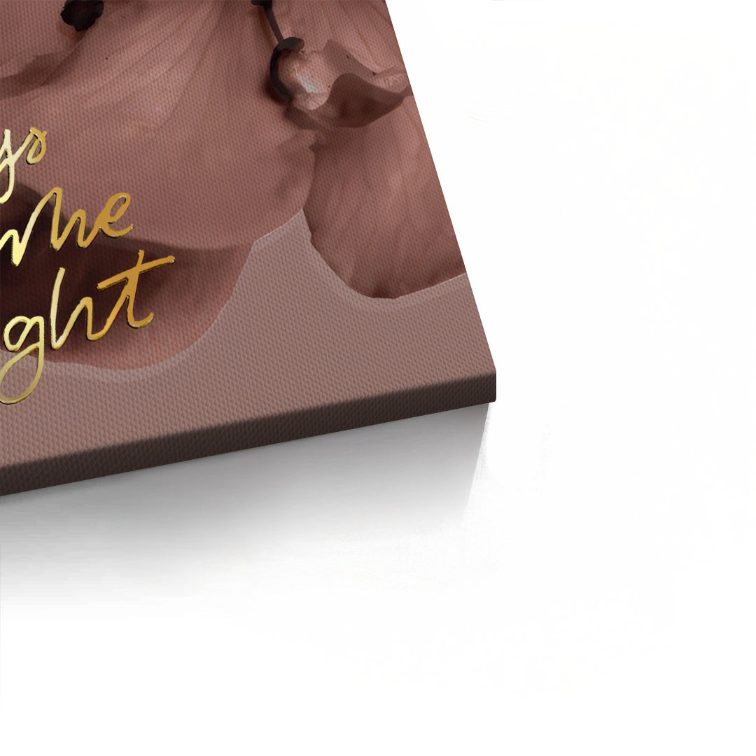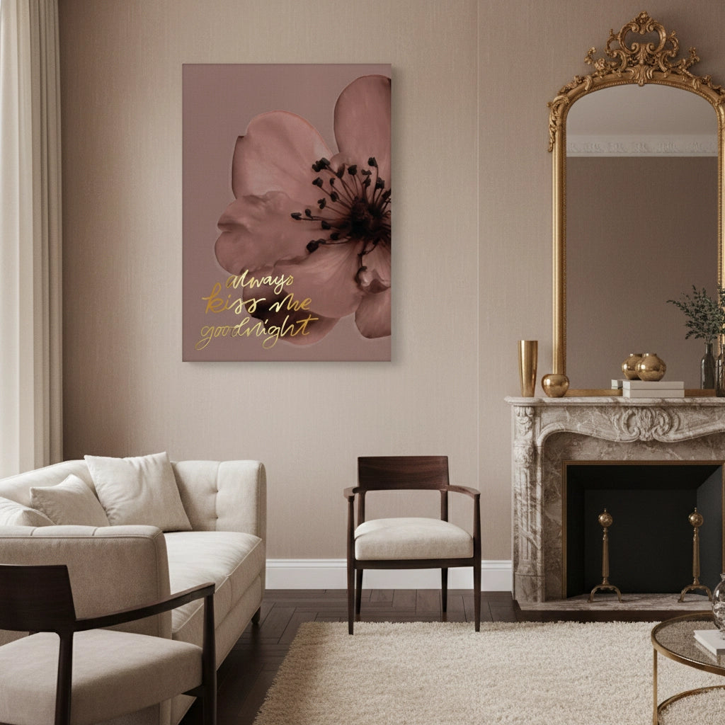 The delicate Always Kiss Me Goodnight - Floral Sentiment print captures a moment of gentle romance and elegance. The sentimental phrase "Always kiss me goodnight" is beautifully rendered in flowing, handwritten metallic gold script. This luminous text is delicately overlaid onto a soft-focus photographic backdrop of a large, dusky pink or mauve flower. The muted floral tones combined with the gold typography create a serene yet luxurious aesthetic. Ideal for adding a romantic, gentle accent to a bedroom, dressing room, or sophisticated living area in Dubai.