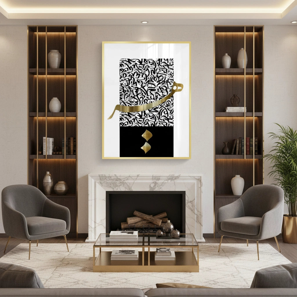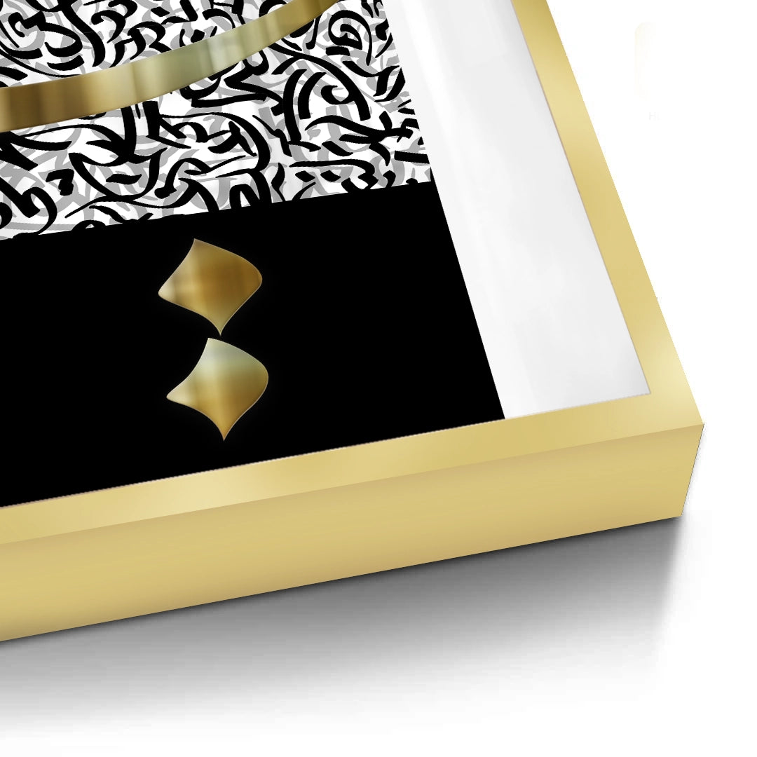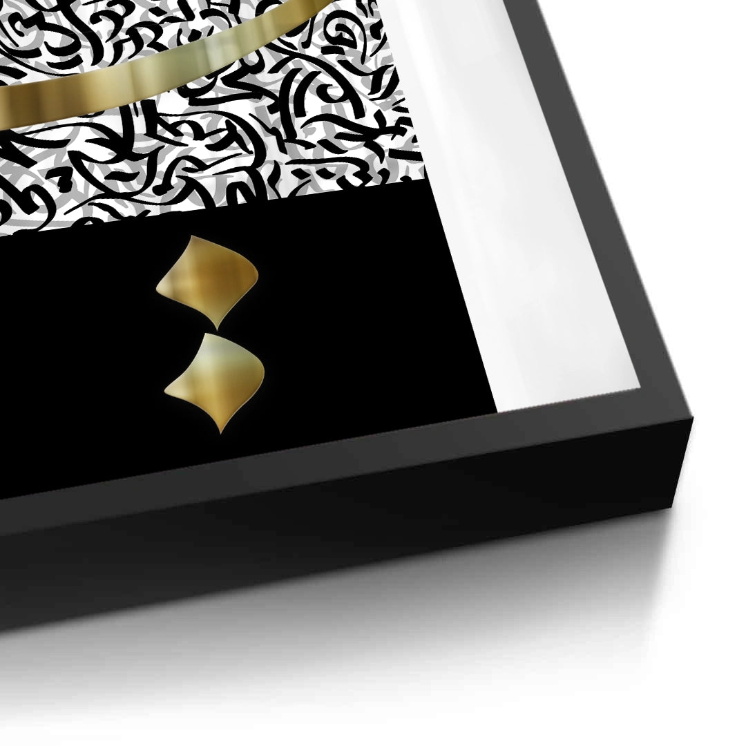 The striking An-Nuqat - The Dot and The Pen print is a profound minimalist interpretation of Surah Al-Qalam's powerful opening. The upper section features flowing white calligraphy against a dramatic black and grey expressive background. Dominating the lower space is the simplified, bold black 'Nun' (ن) letter, highlighting the concept of the single Arabic dot ('Nuqat') and its significance in language and creation. This artwork offers a high-contrast, contemplative, and intensely spiritual statement. Ideal for modern, sophisticated spaces in Dubai.