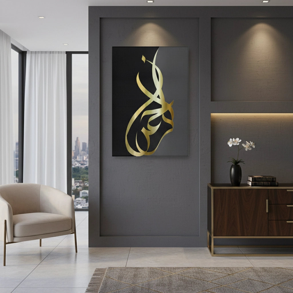 Invoke a sense of divine peace with the Ar-Rahman art print from Jasmine Art. Featuring the sacred name of Allah, "The Most Merciful," in stunning golden Arabic calligraphy, this piece boasts a modern, vertical flowing style. The metallic gold lettering is perfectly balanced against a sophisticated dual-tone grey and black gradient background. Finished with our signature premium vertical texture, this artwork offers a luxurious tactile feel that elevates traditional spiritual art to a contemporary gallery standard. A perfect centerpiece for a modern home, a prayer room, or an elegant majlis in Dubai.