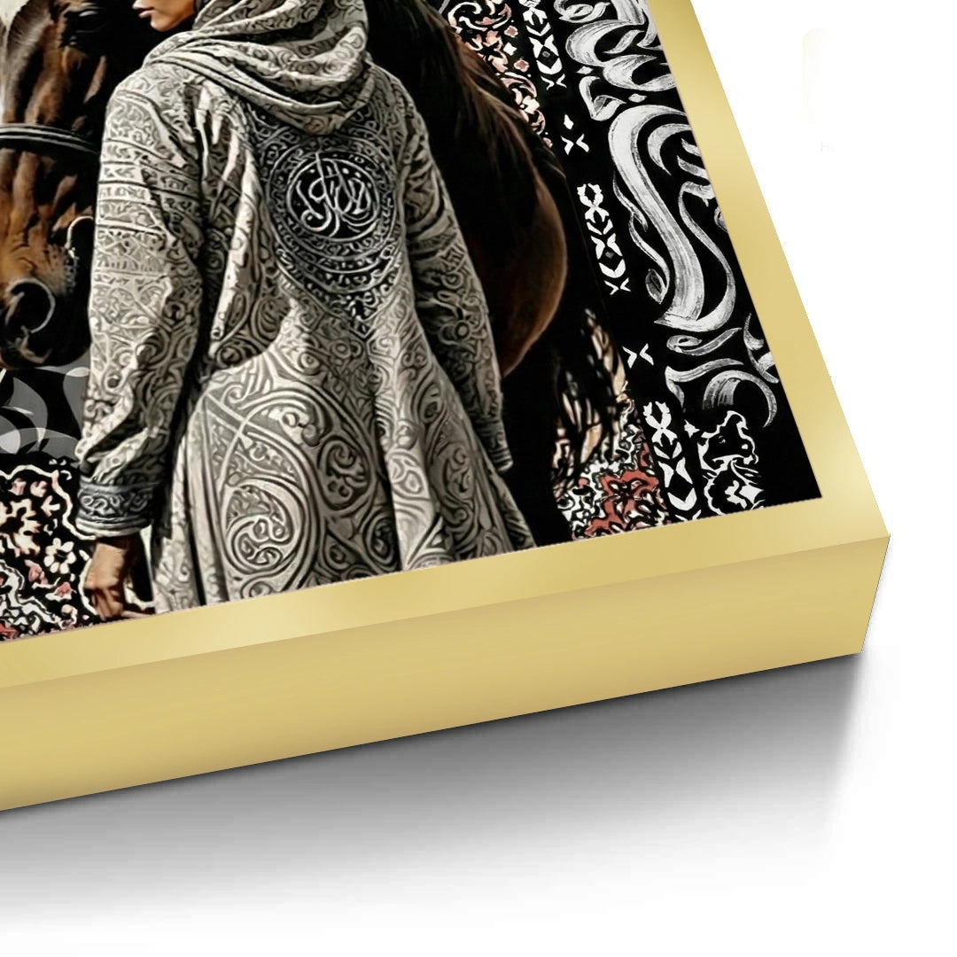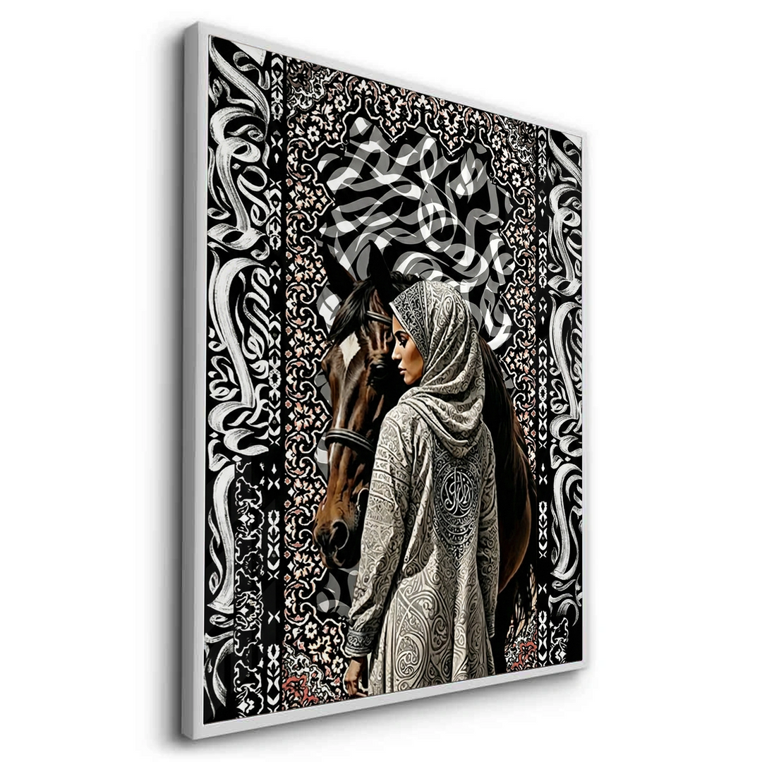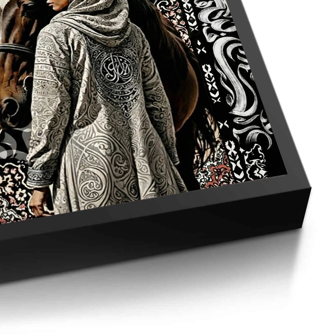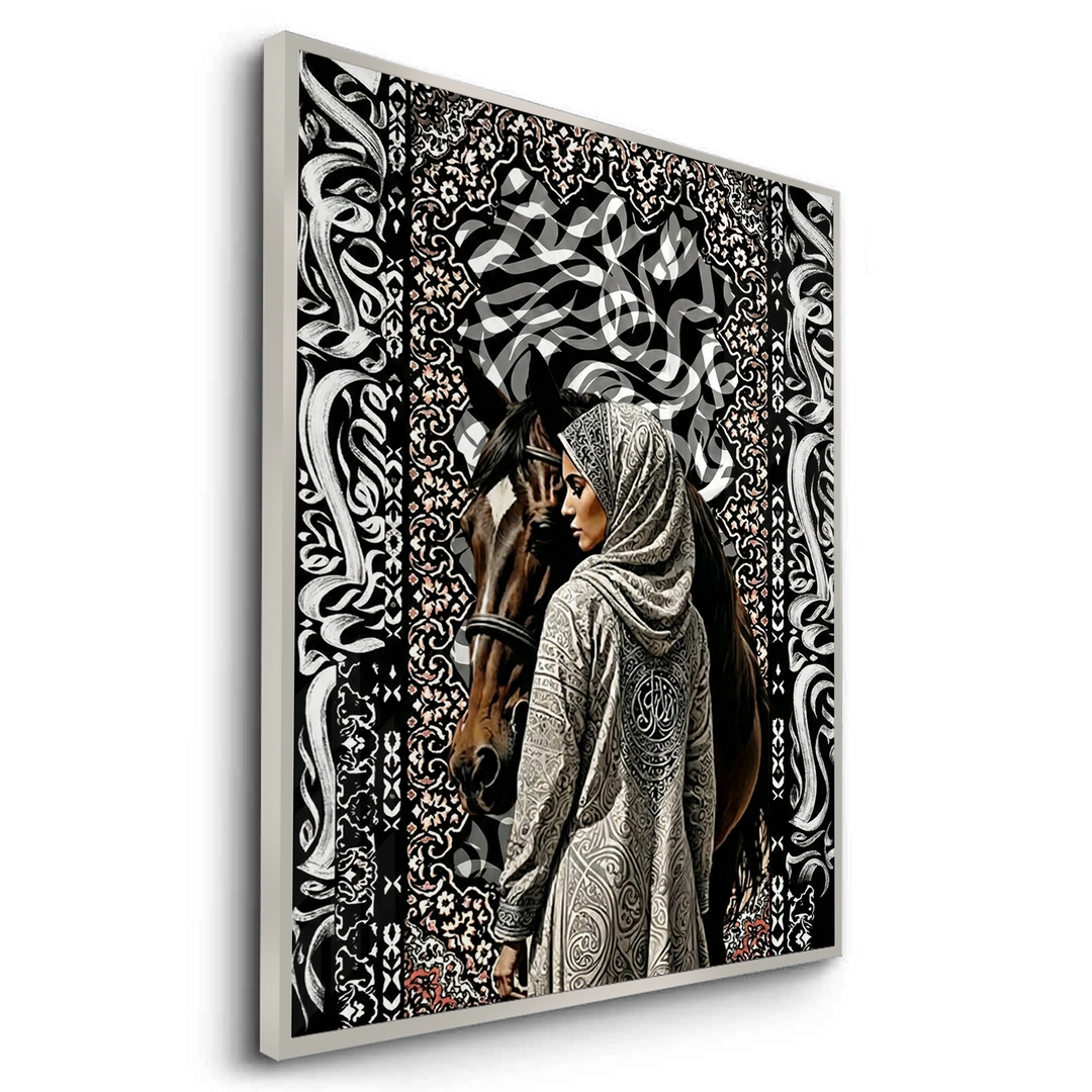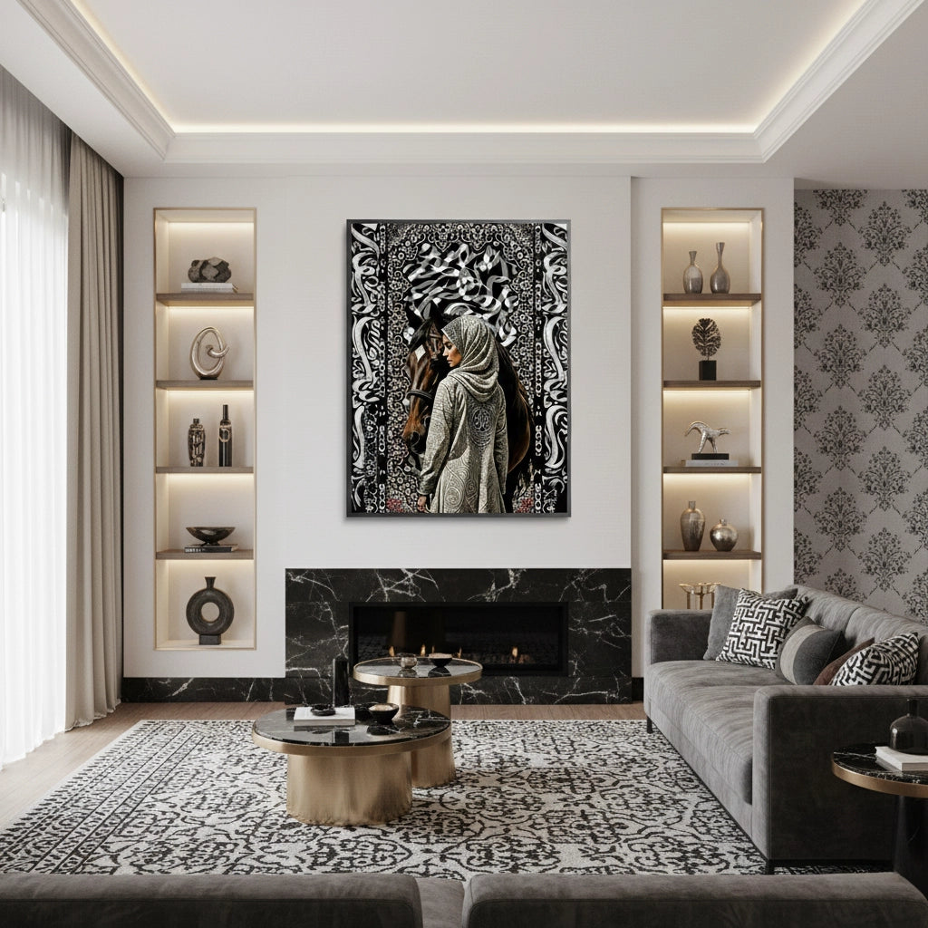 The majestic Arabian Horse - Intricate Pattern print is a luxurious homage to Arabian heritage and Islamic design. This highly detailed artwork features an elegant Arabian horse standing alongside a dignified woman in a patterned hijab and robe. The entire composition is enveloped in complex black, white, and subtle pink Islamic geometric and arabesque patterns, including abstract calligraphy in the background and a prominent calligraphy motif on the woman's back. This piece is perfect for adding a culturally rich, sophisticated, and deeply decorative statement to a majlis or upscale reception area in Dubai.