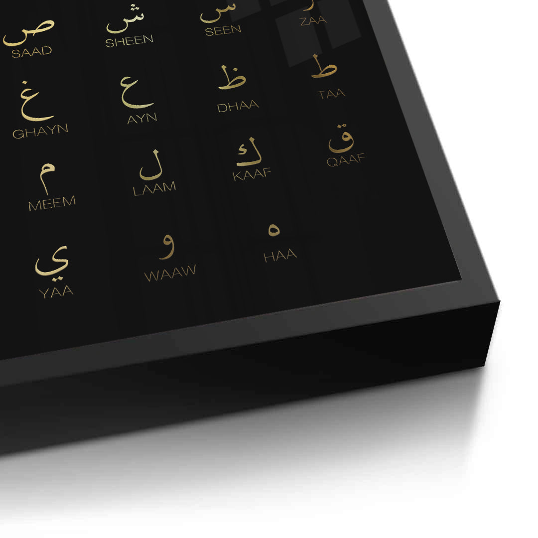 Celebrate the beauty of language with the Arabic Alphabet art print from Jasmine Art. This sophisticated piece showcases the complete Arabic alphabet in stunning metallic gold, accompanied by clear English phonetic labels for each letter. Set against a deep, textured black background, it serves as both an educational tool and a luxurious decor statement. Finished with our signature premium vertical texture, this print offers a high-end tactile finish that radiates gallery-standard quality. An ideal addition to a child’s room, a study, or a cultural center in Dubai.