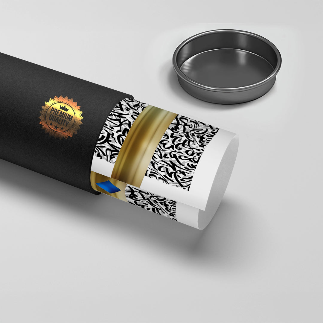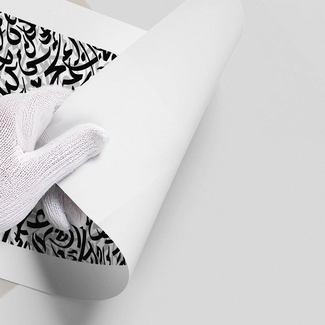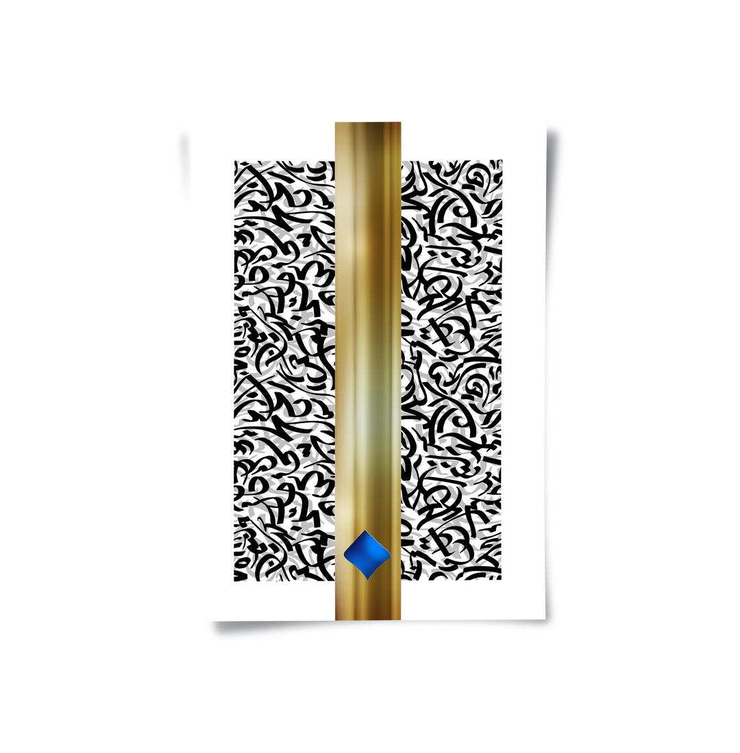The impactful Aurum Divide - Script & Burl Wood print is a contemporary study in contrast and texture. The piece is sharply divided into two distinct halves: the upper section showcases a dynamic, high-density pattern of black and white abstract Arabic script, while the lower section provides stability with the luxurious, warm brown texture of Burl Wood. Two luminous metallic gold diamond shapes elegantly bridge this textural division. Ideal for adding a bold, modern, and high-end textural focal point to a sophisticated office or contemporary living room in Dubai.