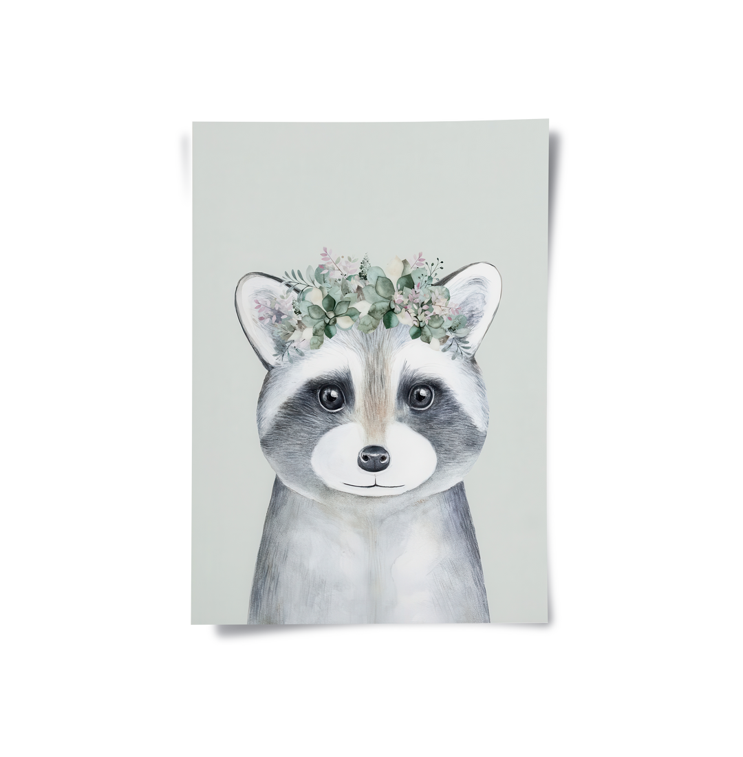 A beautifully soft and detailed print of an utterly adorable Baby Raccoon. This gentle animal portrait, often featuring muted earth tones, is perfect for a nature-themed nursery, creating a calm and loving atmosphere in the UAE home.