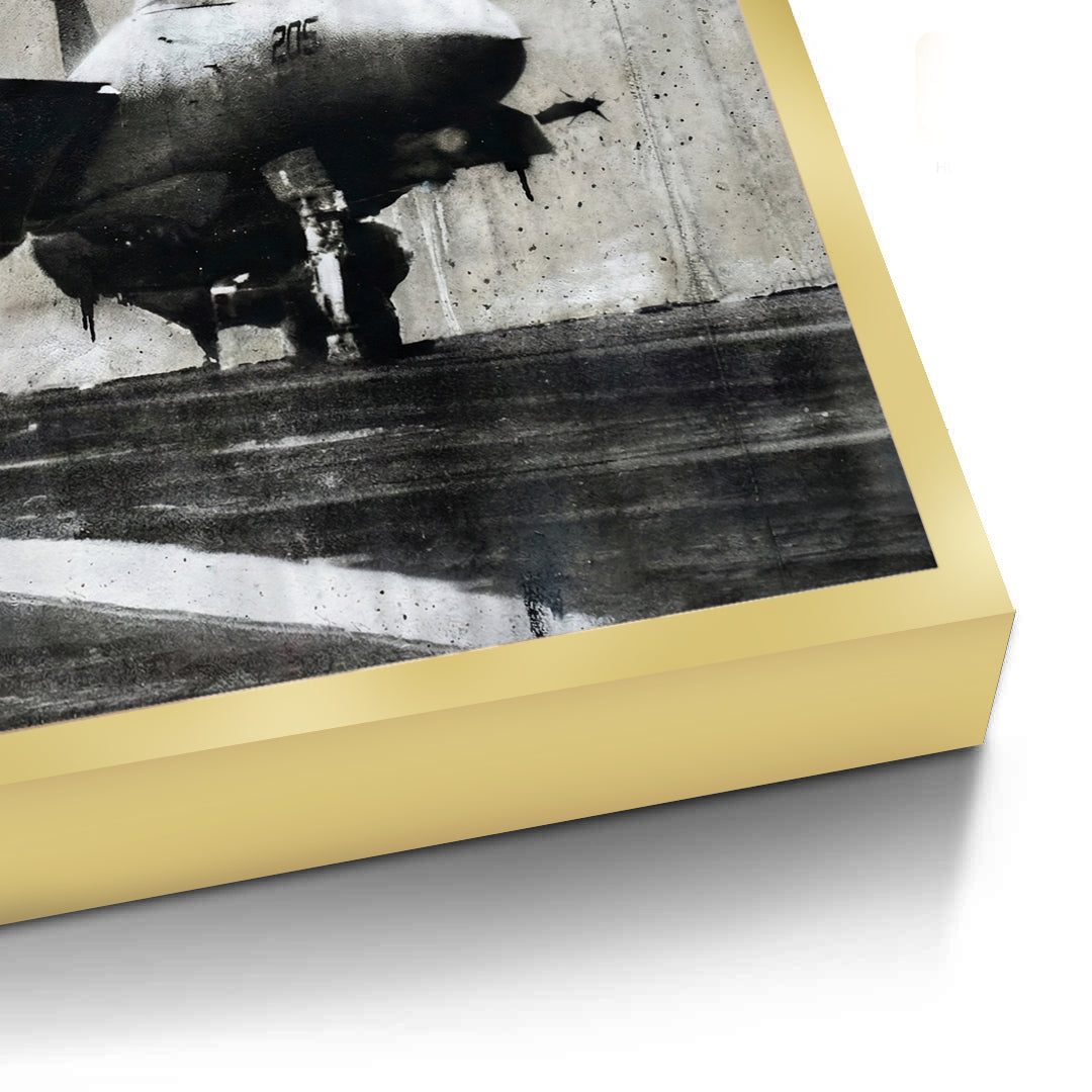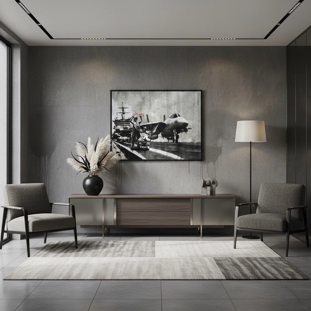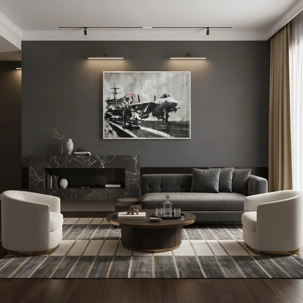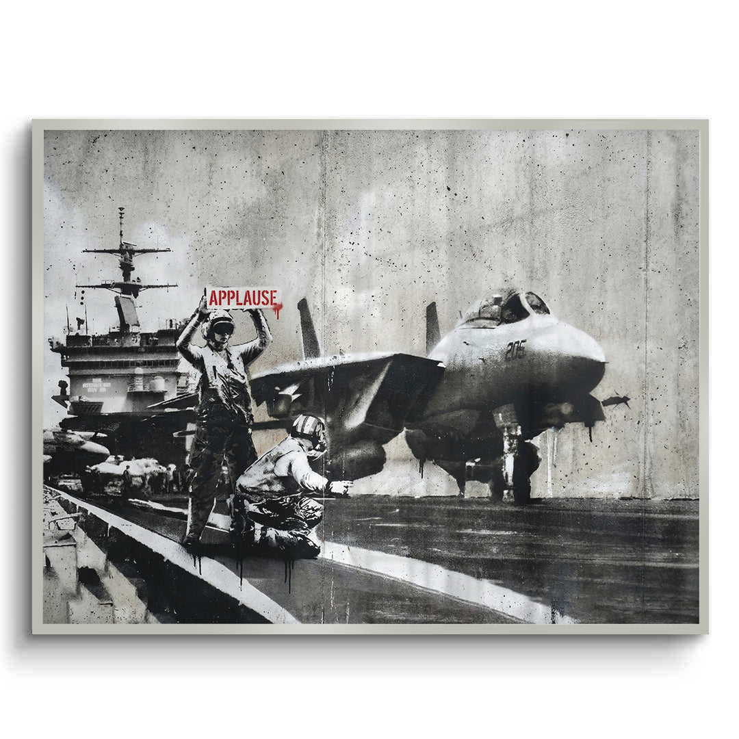 Challenge your perspective with the Banksy Applause art print from Jasmine Art. This provocative piece captures a tense moment on an aircraft carrier deck where a crew member holds up a bright red "APPLAUSE" sign as a fighter jet prepares for takeoff. It is a powerful critique of the glorification of conflict in the modern age. Finished with our signature premium vertical texture, this gritty urban design is elevated into a sophisticated gallery-standard masterpiece. A bold and thought-provoking statement for a modern study, industrial-style lounge, or creative space in Dubai.