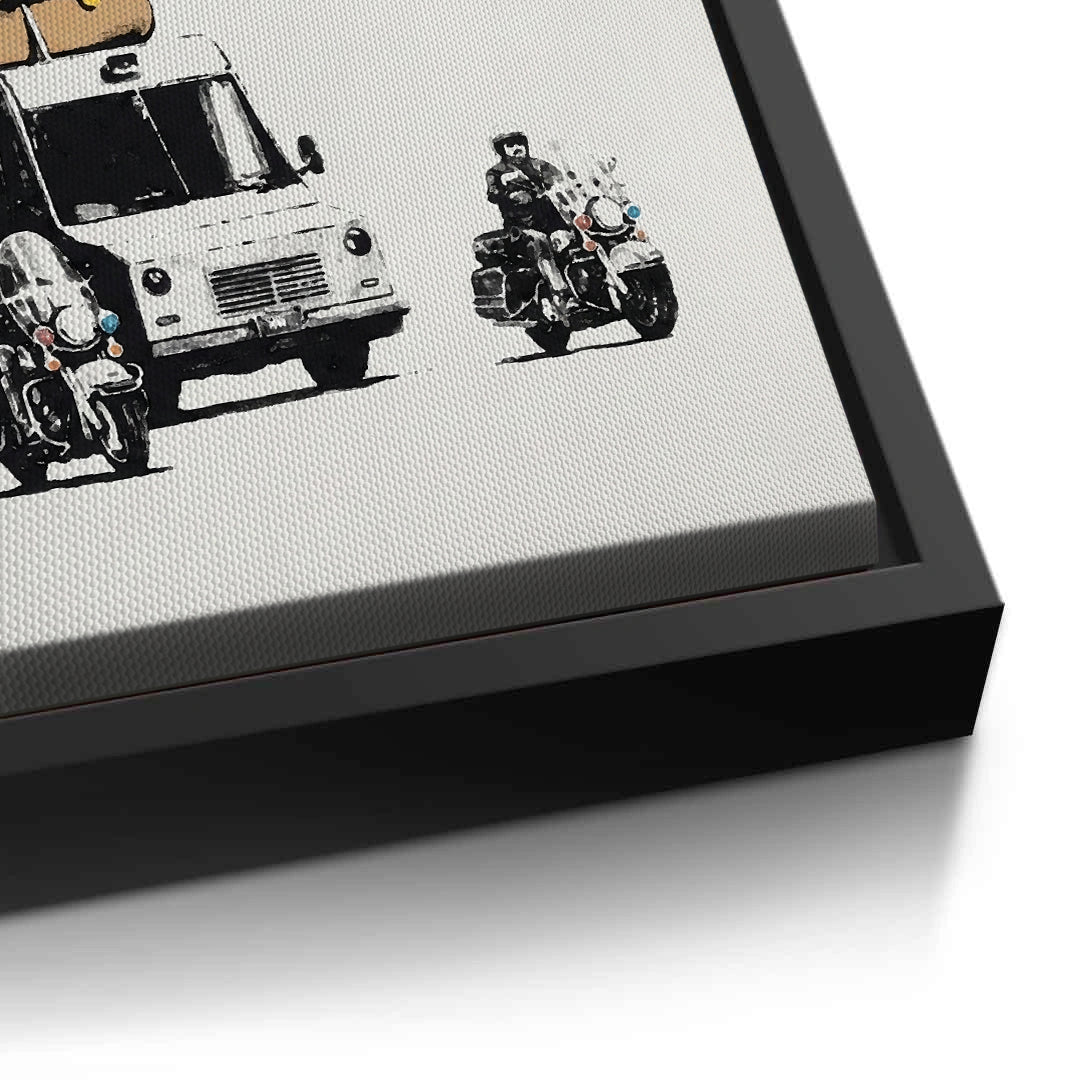 Serve up some social satire with the Banksy Burger Van art print from Jasmine Art’s Banksy series. This witty piece depicts a giant burger on a delivery truck receiving a full motorcade escort, mocking modern society's obsession with consumerism. The stark contrast of the monochromatic police escort against the vibrant colors of the burger creates a humorous yet powerful focal point. Finished with our signature premium vertical texture, this print elevates edgy street commentary into a luxury decorative masterpiece. A perfect conversation starter for a modern dining area, kitchen, or creative office in Dubai.