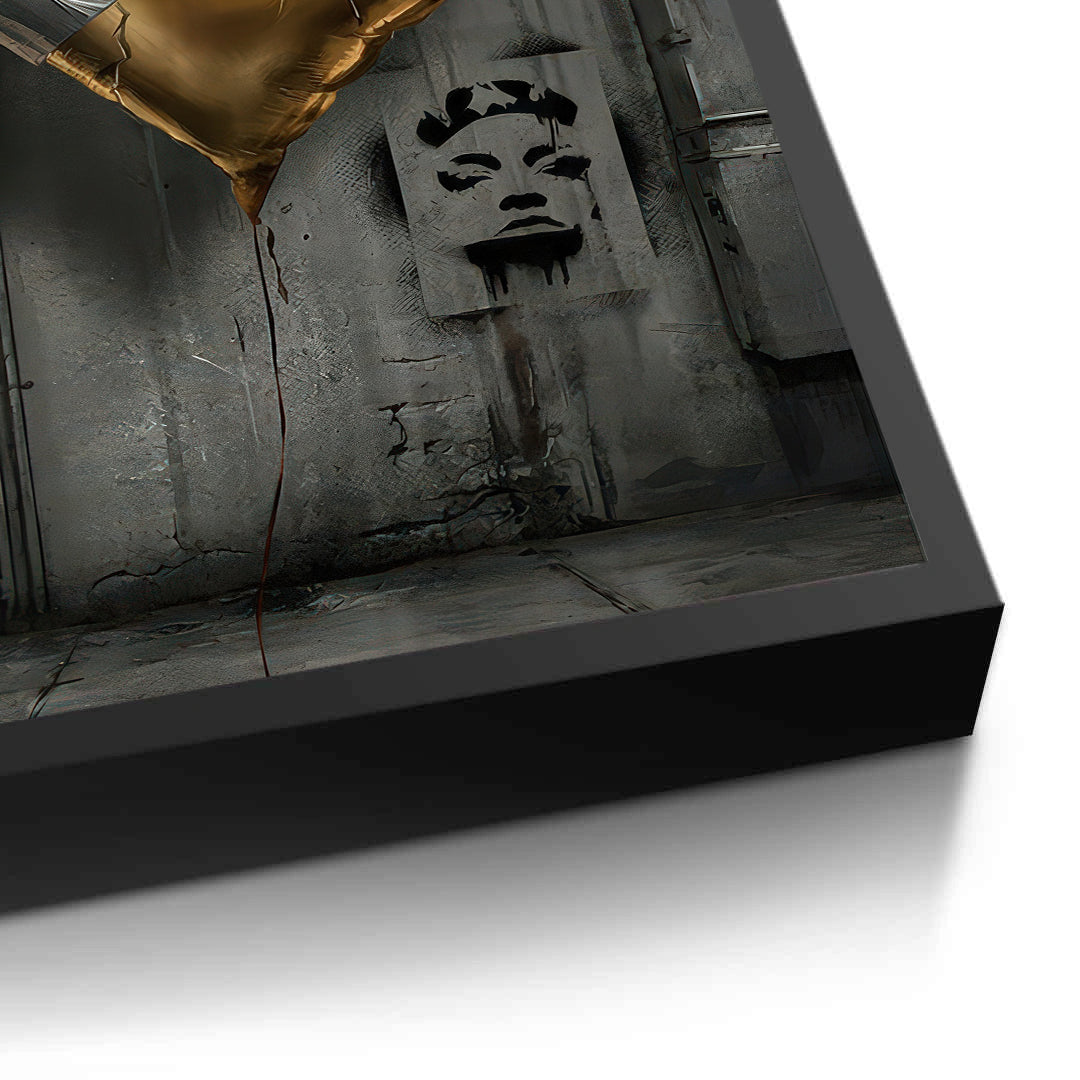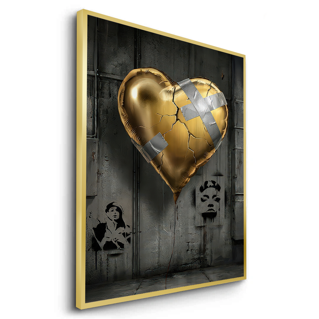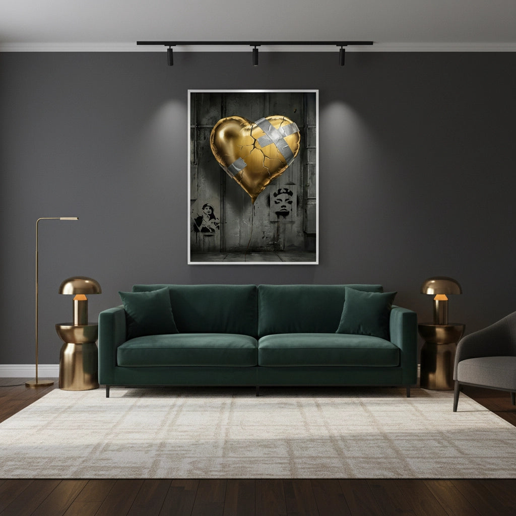 Redefine your walls with the Mended Gold Heart from Jasmine Art’s Banksy series. This striking piece features a brilliant metallic gold heart balloon, cracked yet held together with silver tape, symbolizing resilience and the beauty of healing. The fusion of luxury gold tones with gritty urban stencils creates a sophisticated street-art aesthetic. Finished with our signature premium vertical texture, this print offers incredible tactile depth and a high-end gallery finish. An ideal centerpiece for a luxury penthouse, a modern bedroom, or a chic lounge in Dubai.