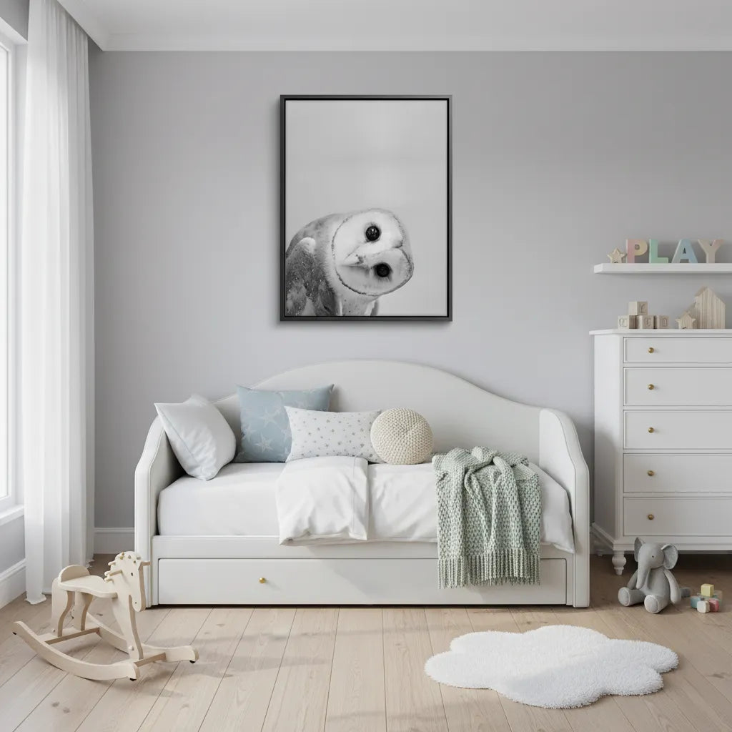 Bring the sophisticated magic of nature indoors with the serene Barn Owl print. Rendered in a detailed, calming style, this piece is a subtle and elegant choice for a luxury nursery or a woodland-themed bedroom in Dubai.
