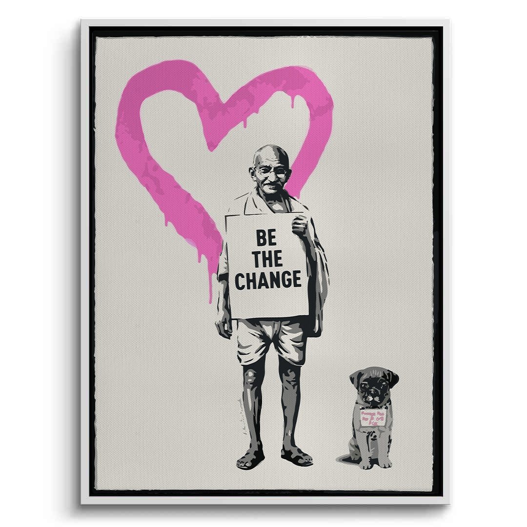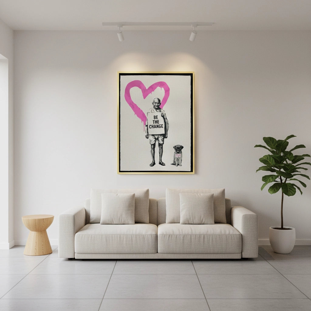 Make a powerful statement with the Be The Change art print from Jasmine Art’s Banksy collection. This iconic piece features a stencil portrait of Gandhi holding a message of transformation, backed by a striking pink dripping heart. Combining street art edge with a profound message of peace, this artwork serves as a daily source of inspiration. Finished with our signature premium vertical texture, it elevates urban graffiti into a high-end gallery masterpiece. A soulful and stylish addition for a modern home office, hallway, or living space in Dubai.
