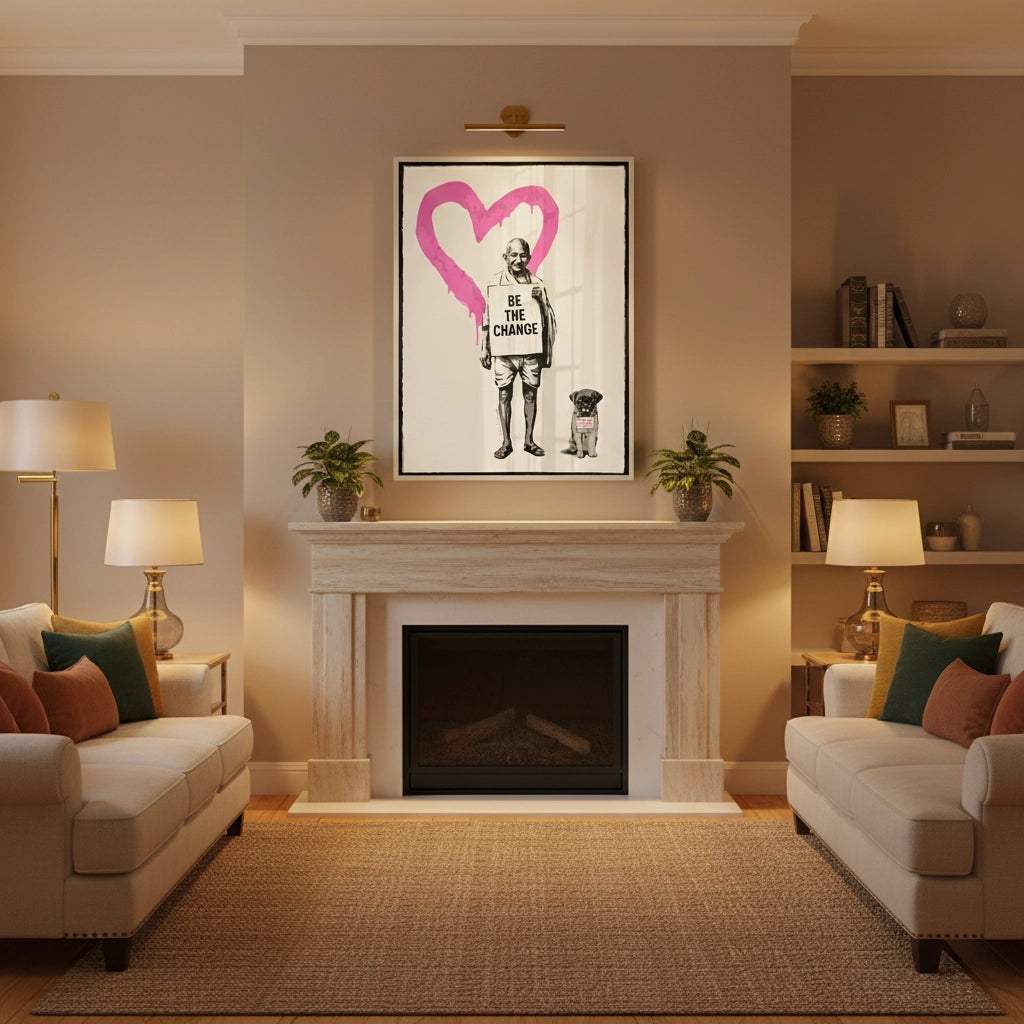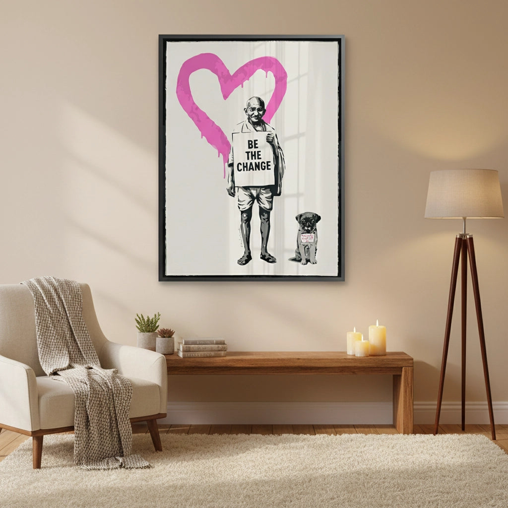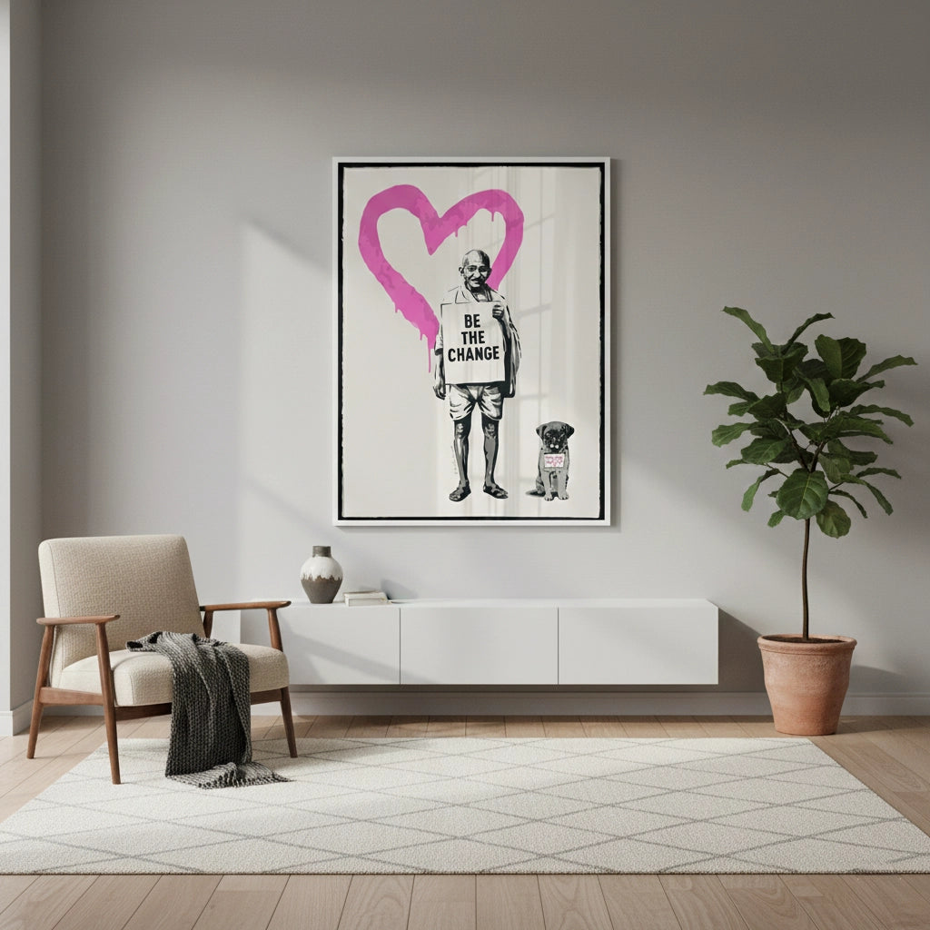 Make a powerful statement with the Be The Change art print from Jasmine Art’s Banksy collection. This iconic piece features a stencil portrait of Gandhi holding a message of transformation, backed by a striking pink dripping heart. Combining street art edge with a profound message of peace, this artwork serves as a daily source of inspiration. Finished with our signature premium vertical texture, it elevates urban graffiti into a high-end gallery masterpiece. A soulful and stylish addition for a modern home office, hallway, or living space in Dubai.