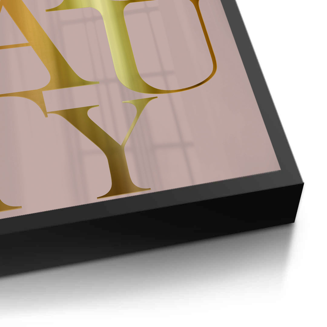 The elegant BEAUTY - Rose Gold Typography Statement print is a striking piece of modern design. The word "BEAUTY" is boldly rendered in a classic Serif font, utilizing a rich metallic gold and bronze gradient that catches the light. This strong vertical typography is beautifully complemented by a soft, textured, dusty pink (mauve) background, creating a feminine yet powerful aesthetic. Ideal for adding a chic, high-fashion statement to a modern dressing room, vanity area, or luxury apartment in Dubai.