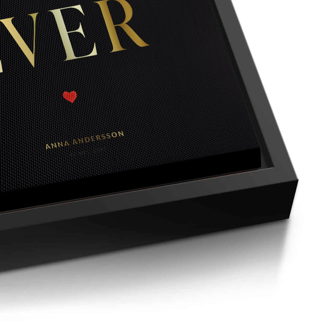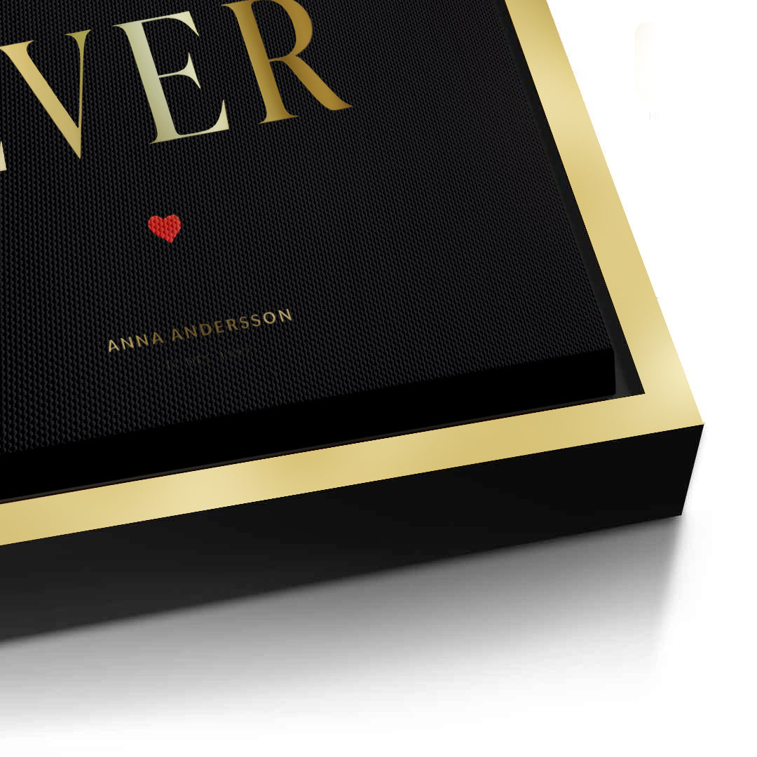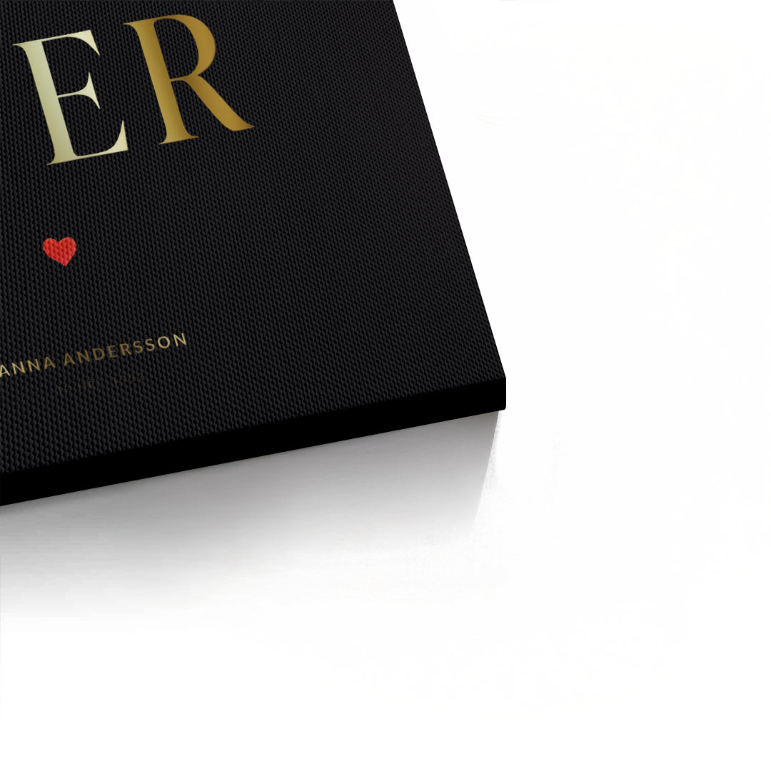 The elegant Best Mom Ever - Personalized Gold Typography print is the perfect luxurious tribute to the world's greatest mother. The bold, affectionate phrase "BEST MOM EVER" is powerfully rendered in large, metallic gold classic Serif typography. This stunning gold text is set against a deep black, textured pinstripe canvas, creating a dramatic, high-contrast finish. The design is subtly accented by a small red heart and features optional space for personalized text (like a name) at the bottom. This artwork serves as an ideal personalized gift or a cherished piece for a modern bedroom or living area in Dubai.