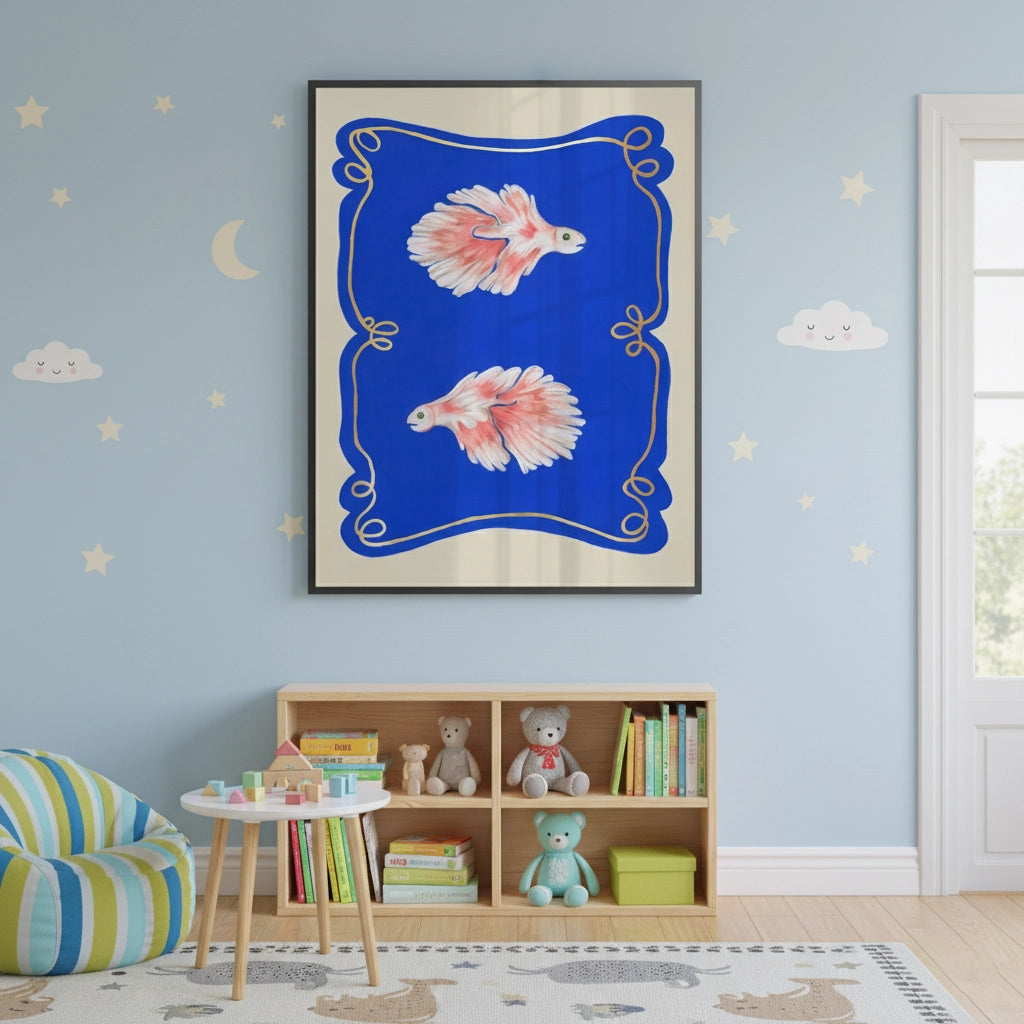 The elegant Betta Fish print brings a touch of aquatic beauty and playful luxury to a child's space. This captivating artwork features two stylized Betta fish with flowing pink and white fins, set against a striking deep royal blue background. The blue panel is framed by an ornate, curving border rendered in shimmering metallic gold foil. This piece is perfect for adding a vibrant color pop, marine charm, and a hint of stylish metallic glamour to a nursery, playroom, or bathroom in Dubai.