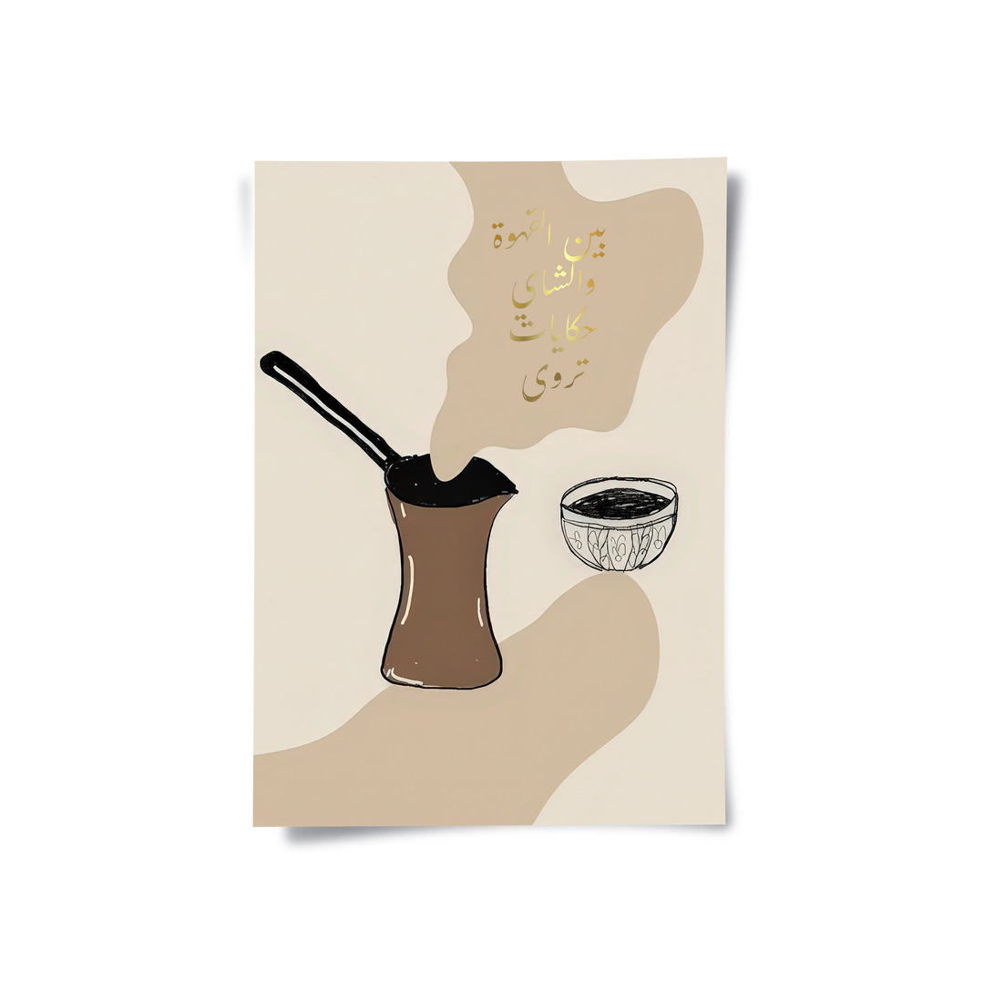 Celebrate the art of conversation with the Coffee & Tea Tales print by Jasmine Art. This illustrative piece features a hand-drawn Dallah with elegant golden Arabic calligraphy that reads, "Between coffee and tea, stories are told". The warm earthy tones and abstract shapes create a cozy yet sophisticated atmosphere, honoring the rich traditions of hospitality. Finished with our signature premium vertical texture, this artwork adds a luxurious tactile depth to your walls. A perfect addition to a modern kitchen, a dining area, or a traditional majlis in Dubai.