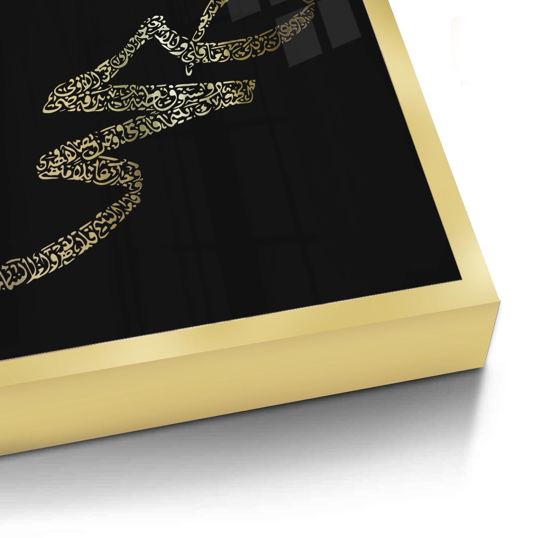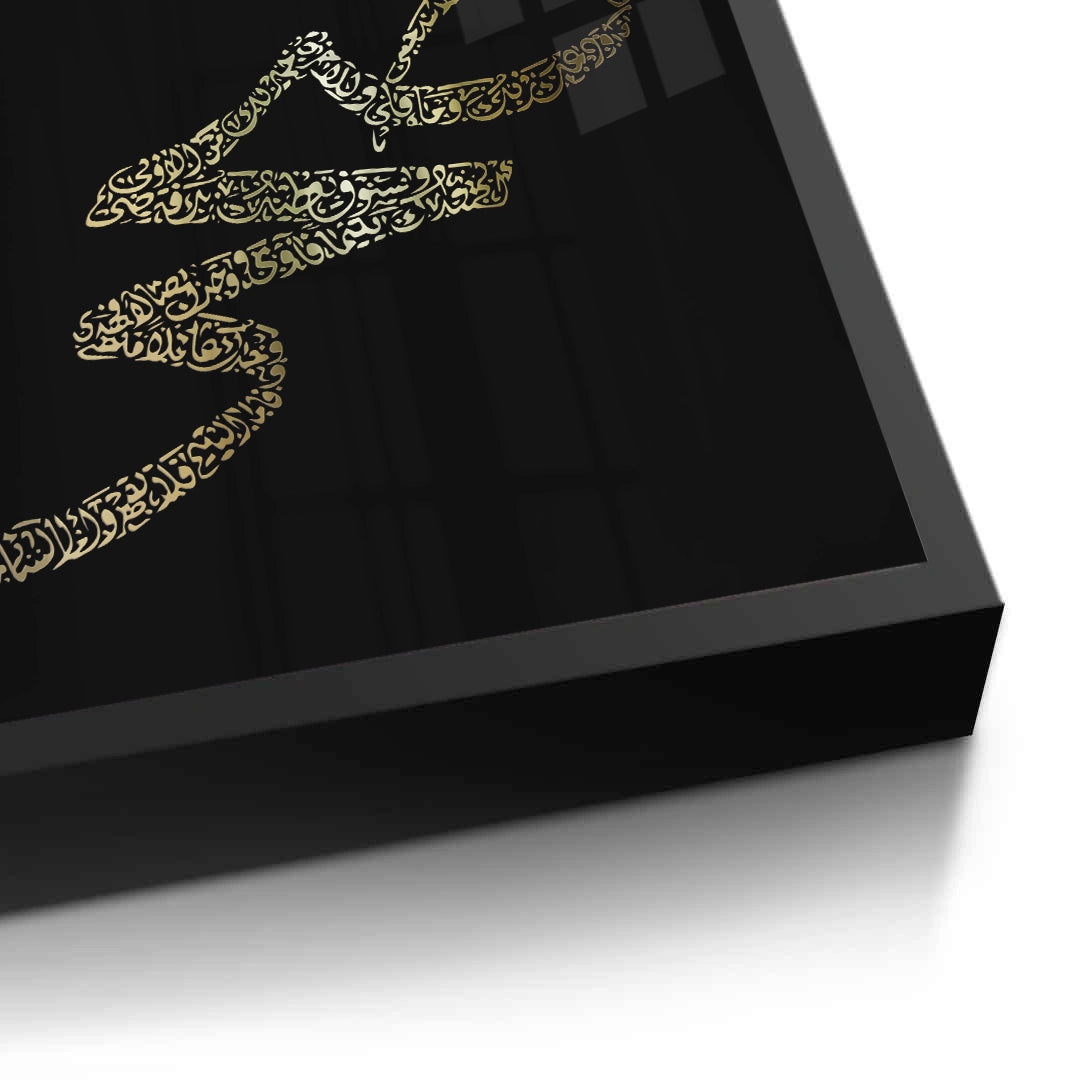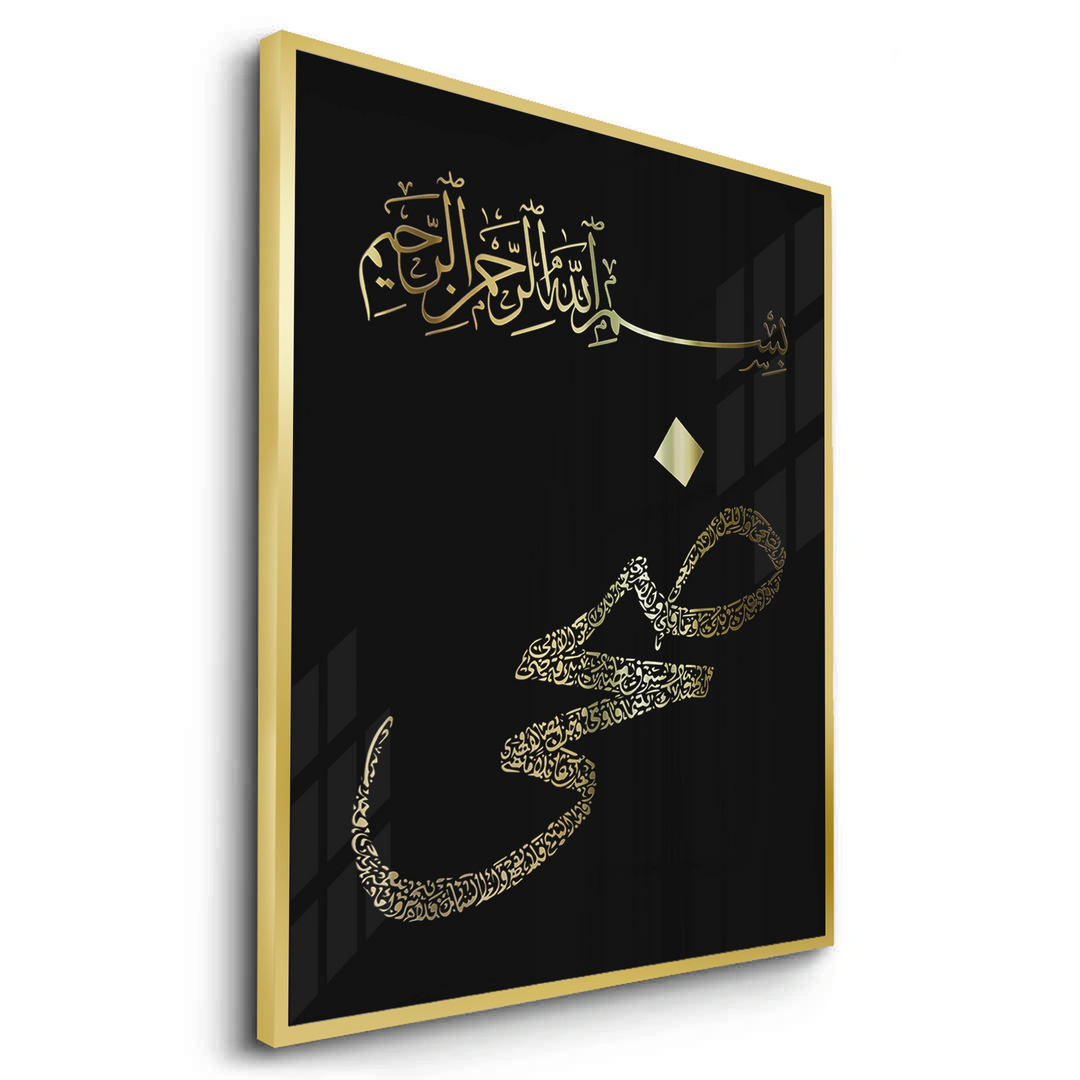 The magnificent Bismillah & Prophet Muhammad (PBUH) - Gold Calligraphy print is a luxurious piece of spiritual devotion. This artwork prominently features "Bismillah hir Rahman nir Raheem" at the top, alongside the name of Prophet Muhammad (PBUH) rendered in a bold, stylized Kufic script. The entire composition is executed in dazzling metallic gold foil against a profound black textured canvas, creating a dramatic and elegant contrast. Ideal for adding a revered, profound, and luxurious cultural statement to any entrance or living space in Dubai.