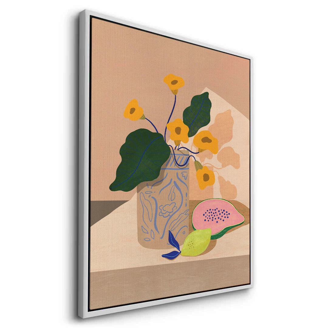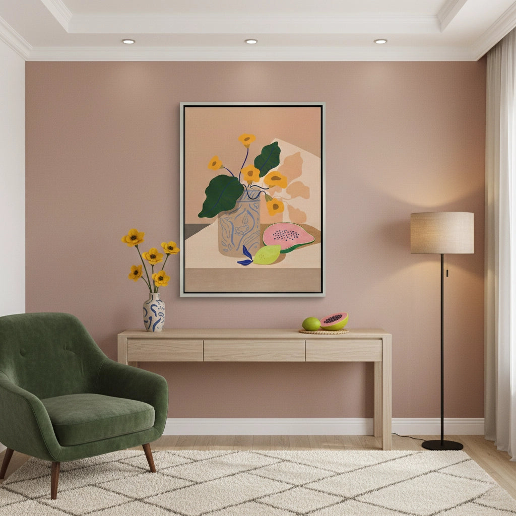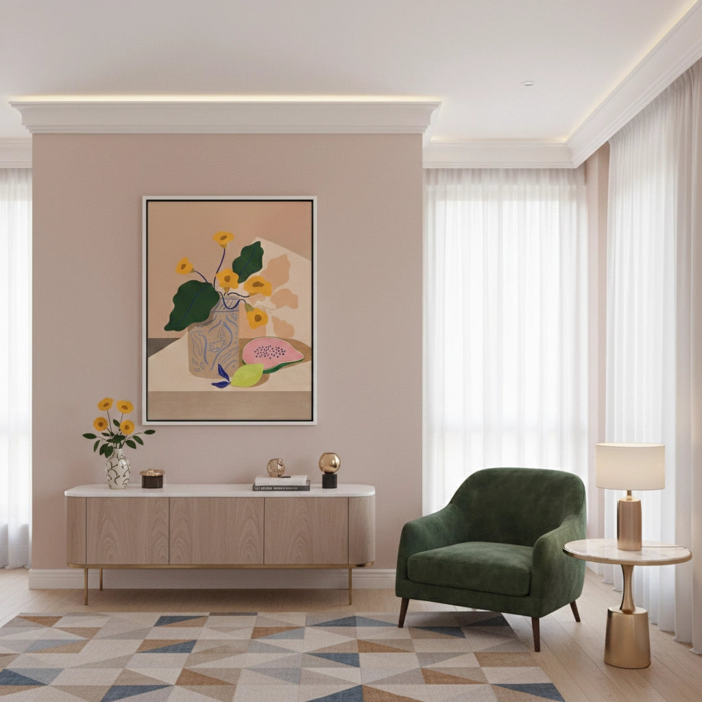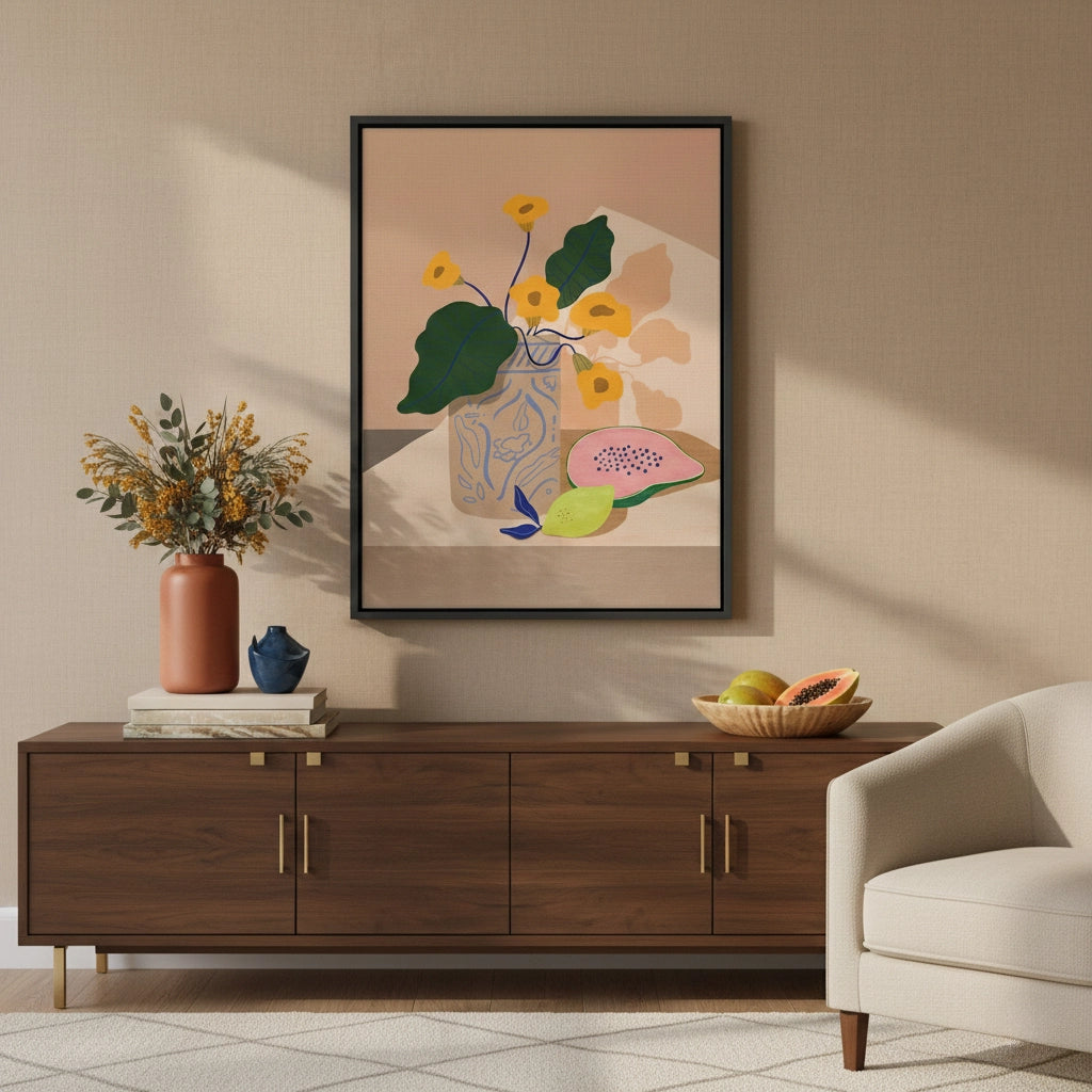 Infuse your home with the warmth of the Mediterranean with the Blue Patterned Vase from Jasmine Art’s Bohemian series. This vibrant still life features a beautifully detailed blue vase filled with golden blooms, paired with exotic fruits in a rich palette of coral, yellow, and terracotta. Its sunny and organic aesthetic creates an inviting and artistic atmosphere in any room. Finished with our signature premium vertical texture, this print offers exceptional tactile depth and a high-end gallery finish. An ideal centerpiece for a modern kitchen, a sun-drenched lounge, or a chic dining space in Dubai.