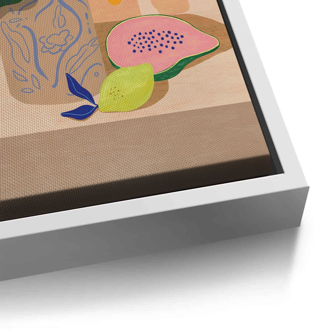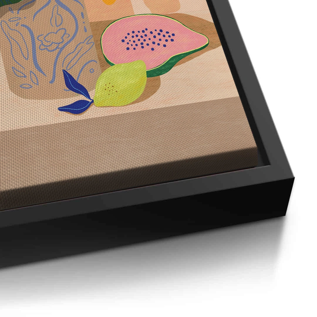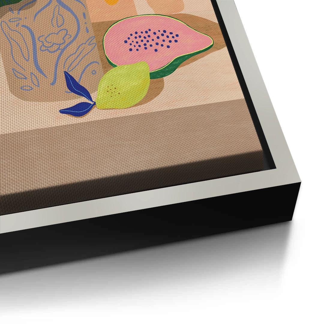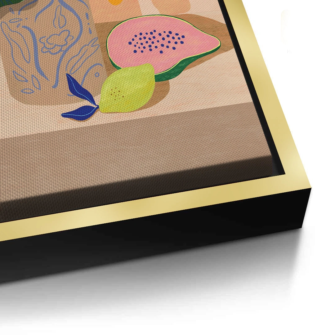 Infuse your home with the warmth of the Mediterranean with the Blue Patterned Vase from Jasmine Art’s Bohemian series. This vibrant still life features a beautifully detailed blue vase filled with golden blooms, paired with exotic fruits in a rich palette of coral, yellow, and terracotta. Its sunny and organic aesthetic creates an inviting and artistic atmosphere in any room. Finished with our signature premium vertical texture, this print offers exceptional tactile depth and a high-end gallery finish. An ideal centerpiece for a modern kitchen, a sun-drenched lounge, or a chic dining space in Dubai.