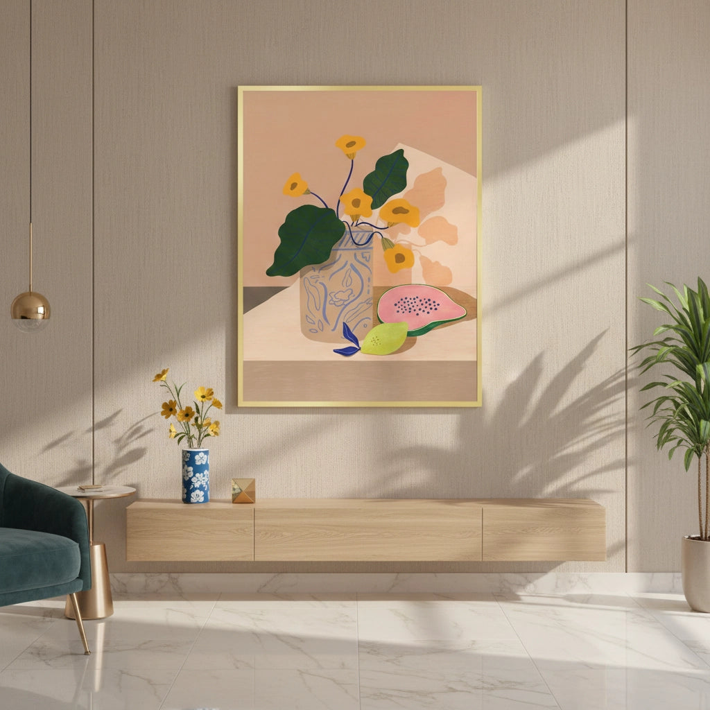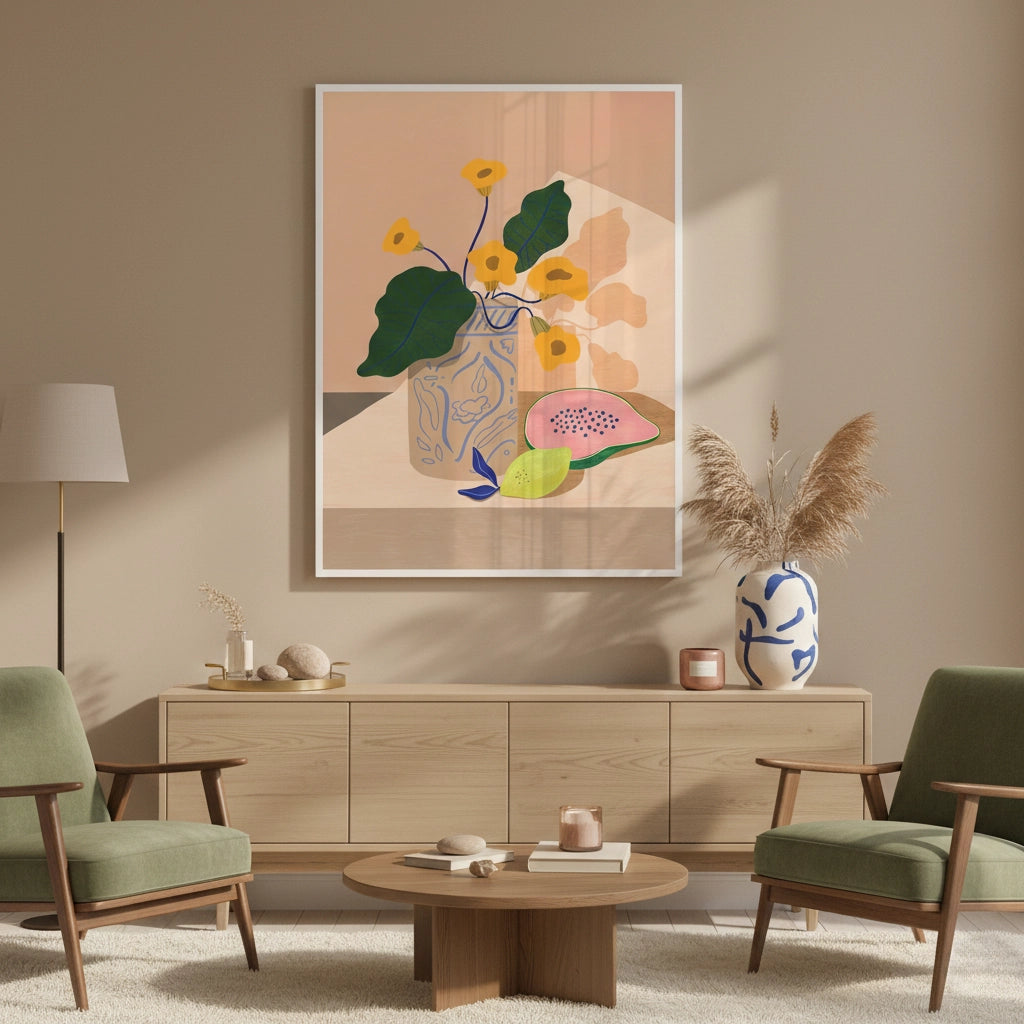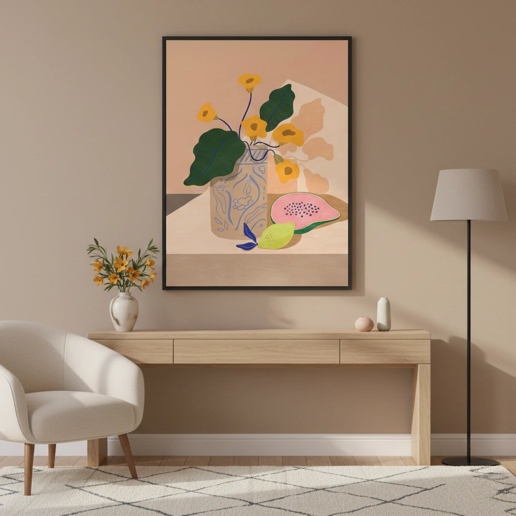 Infuse your home with the warmth of the Mediterranean with the Blue Patterned Vase from Jasmine Art’s Bohemian series. This vibrant still life features a beautifully detailed blue vase filled with golden blooms, paired with exotic fruits in a rich palette of coral, yellow, and terracotta. Its sunny and organic aesthetic creates an inviting and artistic atmosphere in any room. Finished with our signature premium vertical texture, this print offers exceptional tactile depth and a high-end gallery finish. An ideal centerpiece for a modern kitchen, a sun-drenched lounge, or a chic dining space in Dubai.