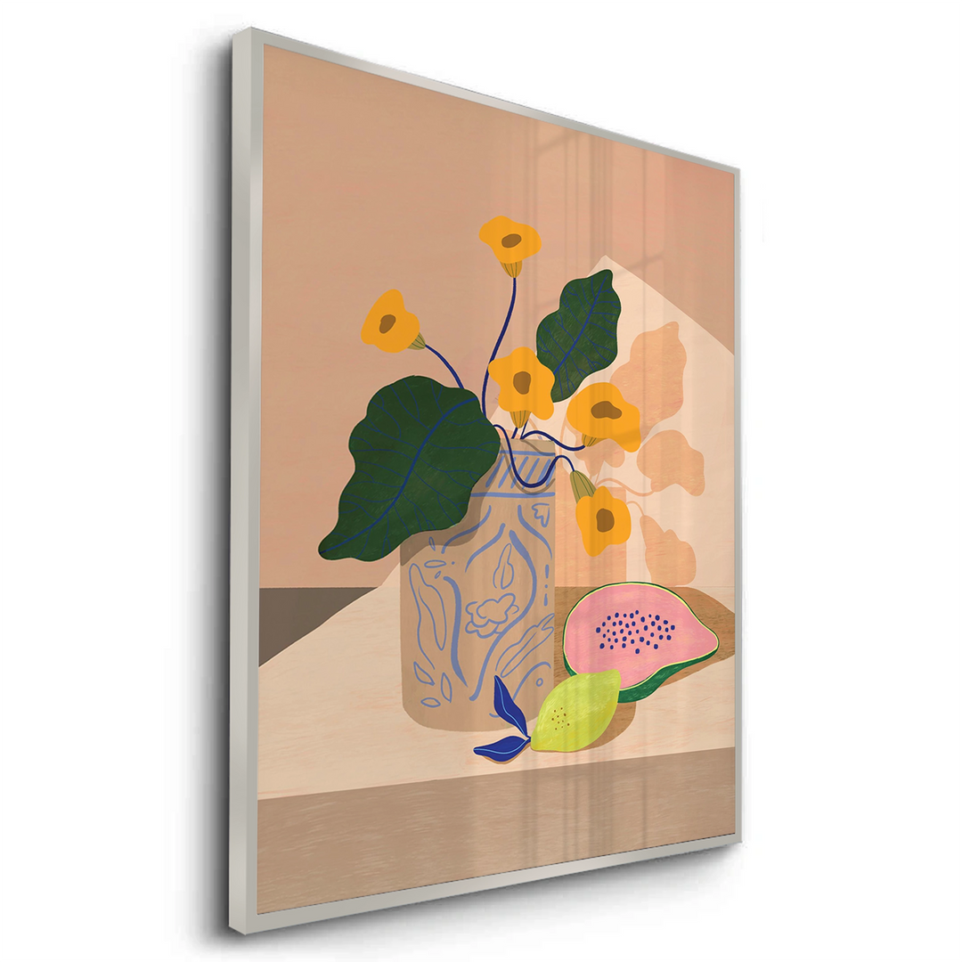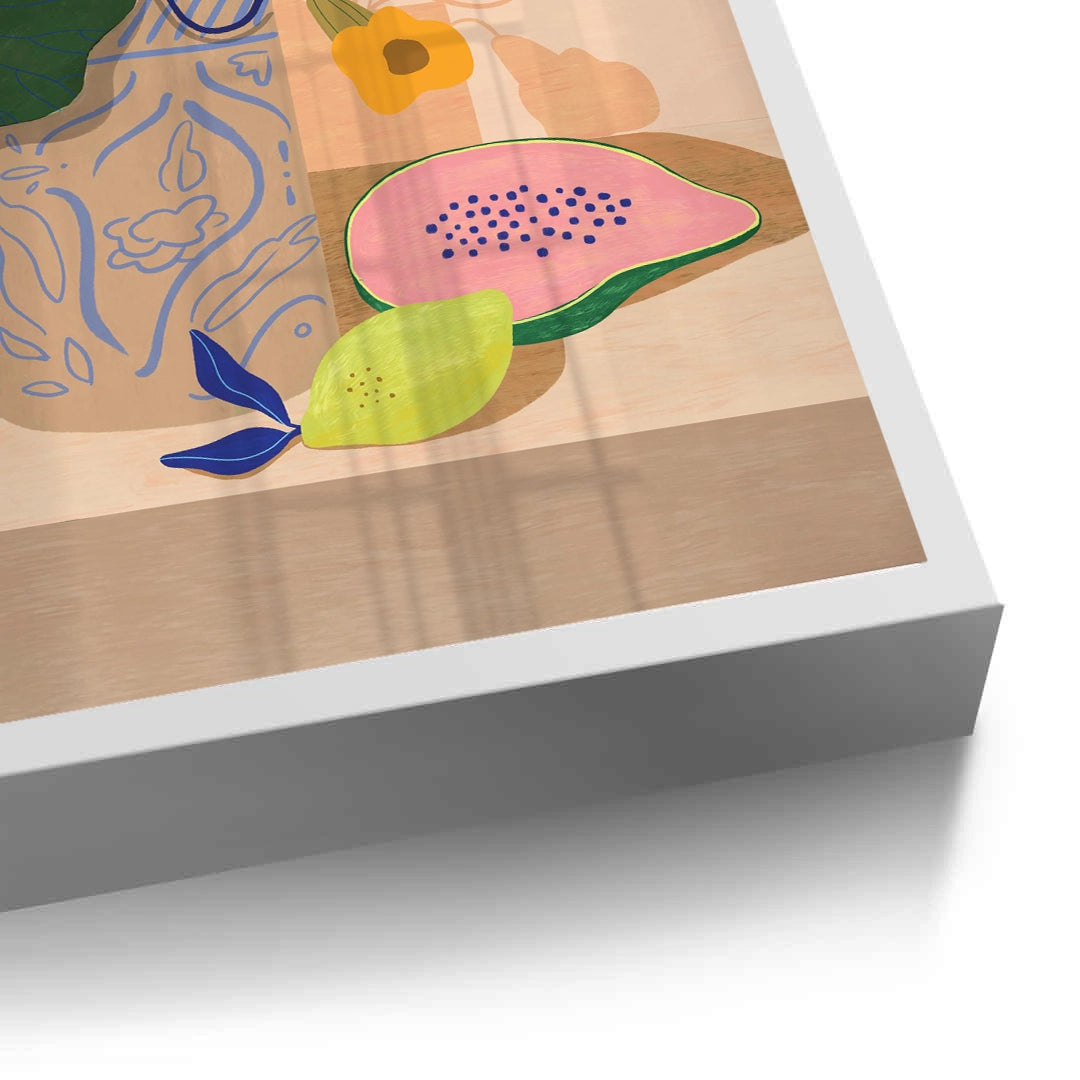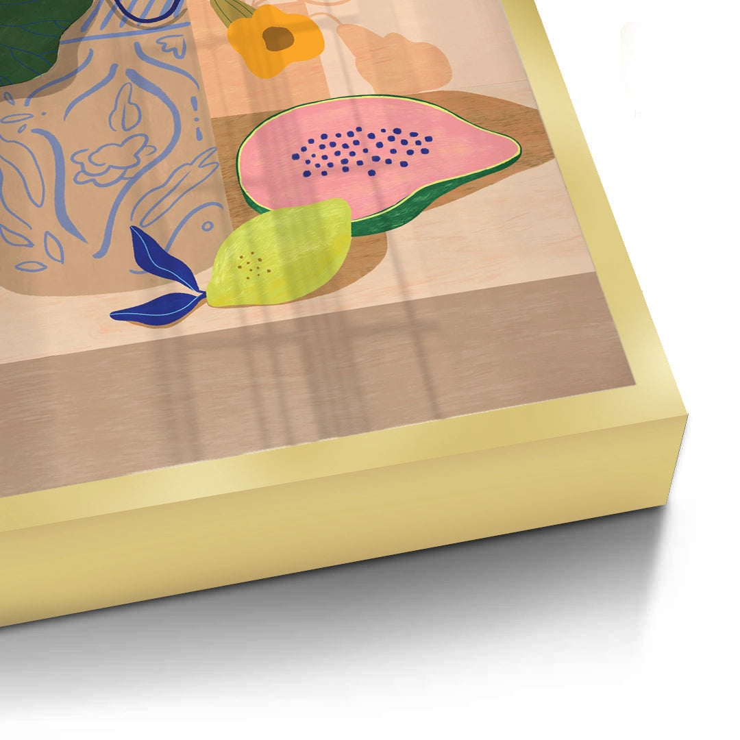 Infuse your home with the warmth of the Mediterranean with the Blue Patterned Vase from Jasmine Art’s Bohemian series. This vibrant still life features a beautifully detailed blue vase filled with golden blooms, paired with exotic fruits in a rich palette of coral, yellow, and terracotta. Its sunny and organic aesthetic creates an inviting and artistic atmosphere in any room. Finished with our signature premium vertical texture, this print offers exceptional tactile depth and a high-end gallery finish. An ideal centerpiece for a modern kitchen, a sun-drenched lounge, or a chic dining space in Dubai.