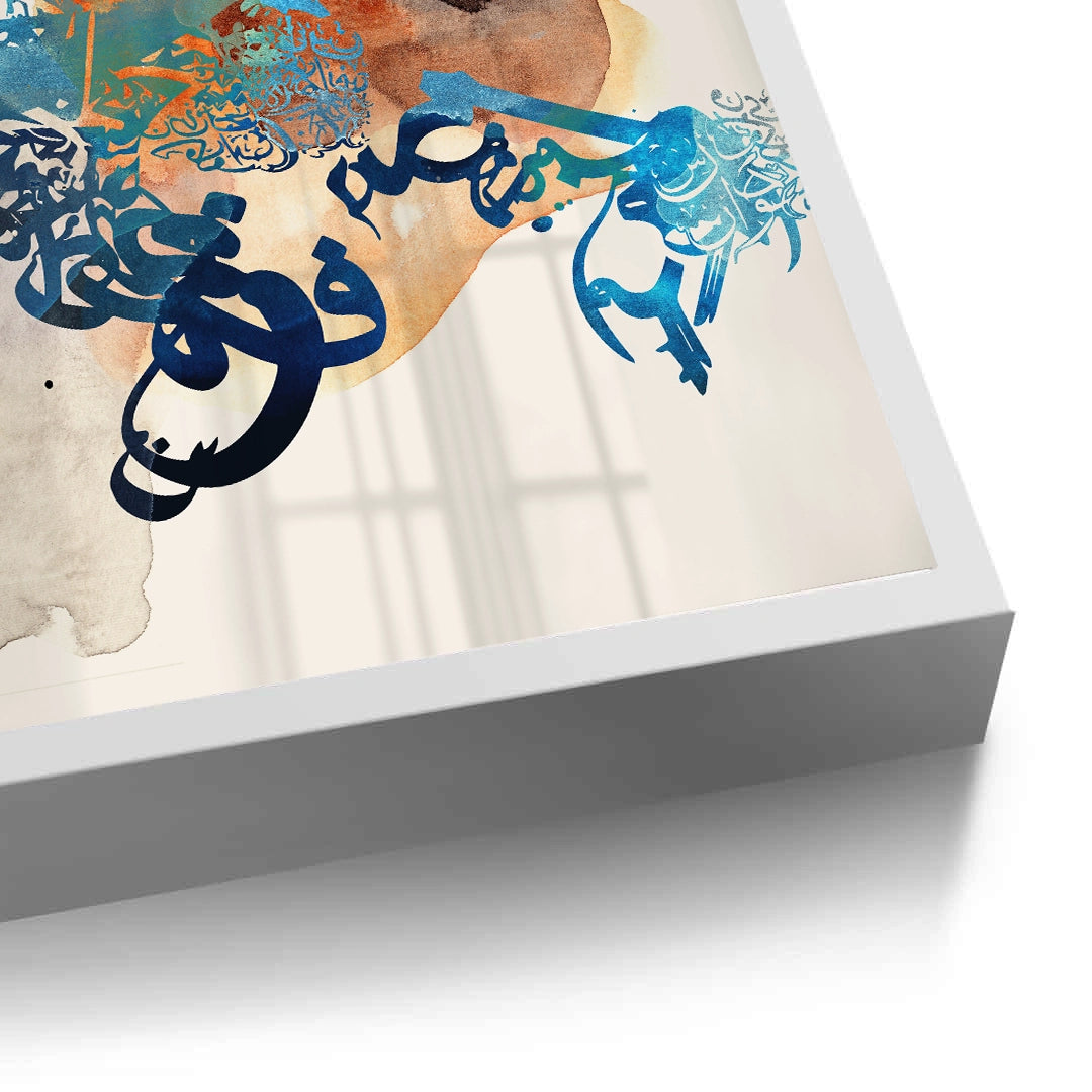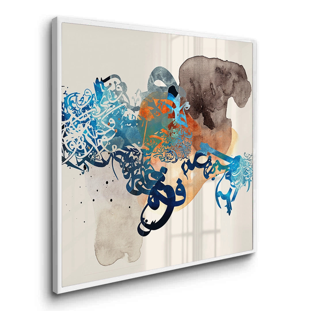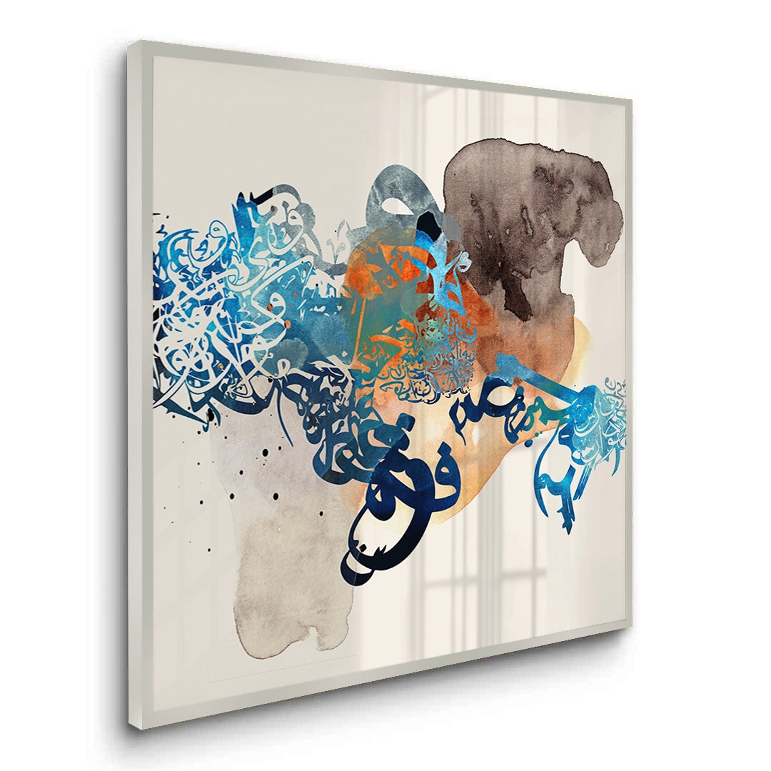 The striking Blue Tide Abstract Calligraphy print is a fine example of modern Islamic abstract expressionism. This artistic piece features a vibrant composition of flowing Arabic script layered over dynamic watercolor washes in rich tones of blue, teal, rust, and brown. The fluid blending of colours gives it a captivating, organic feel, reminiscent of ocean currents. Ideal for adding a modern, expressive, and culturally resonant artistic statement to a sophisticated living space or gallery wall in Dubai.