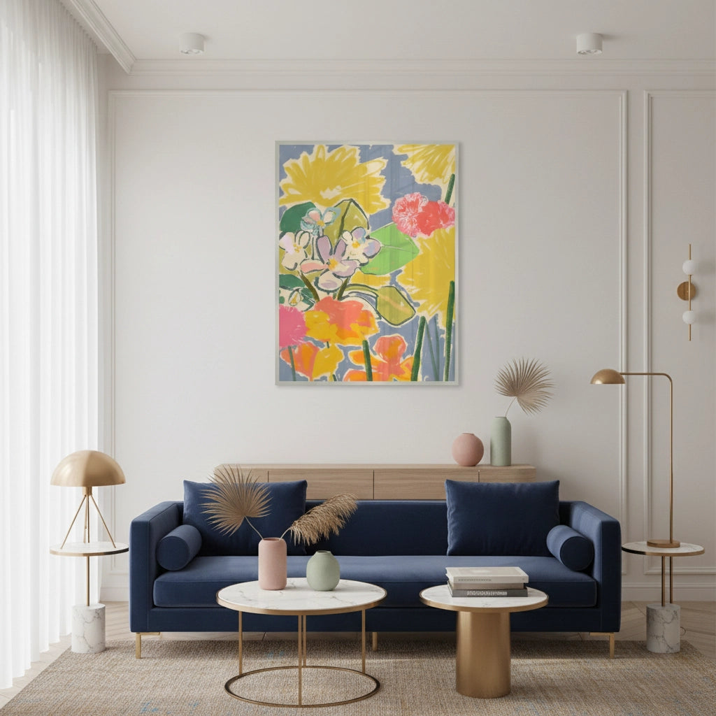 Celebrate the joy of nature with Bohemian Summer Blooms from Jasmine Art’s Bohemian series. This expressive print features a bouquet of wildflowers in a stunning palette of coral, sunflower yellow, and lavender against a soft blue backdrop. Its bold, hand-painted aesthetic brings a fresh and energetic spirit to any modern interior. Finished with our signature premium vertical texture, this print provides exceptional tactile depth and a high-end gallery finish. A perfect statement piece for a bright kitchen, a joyful lounge, or a creative studio space in Dubai.