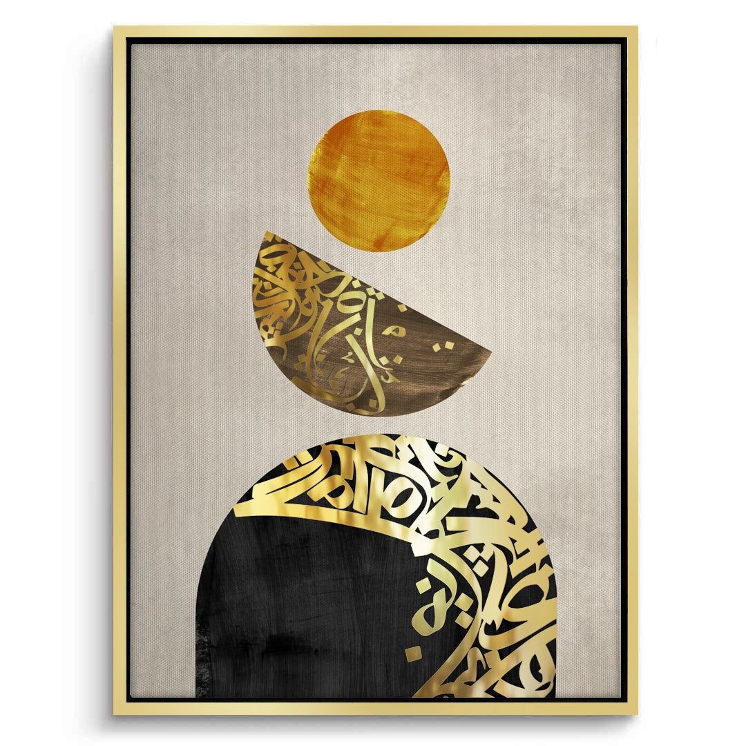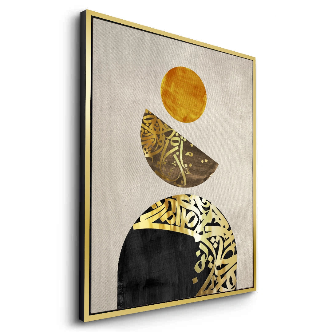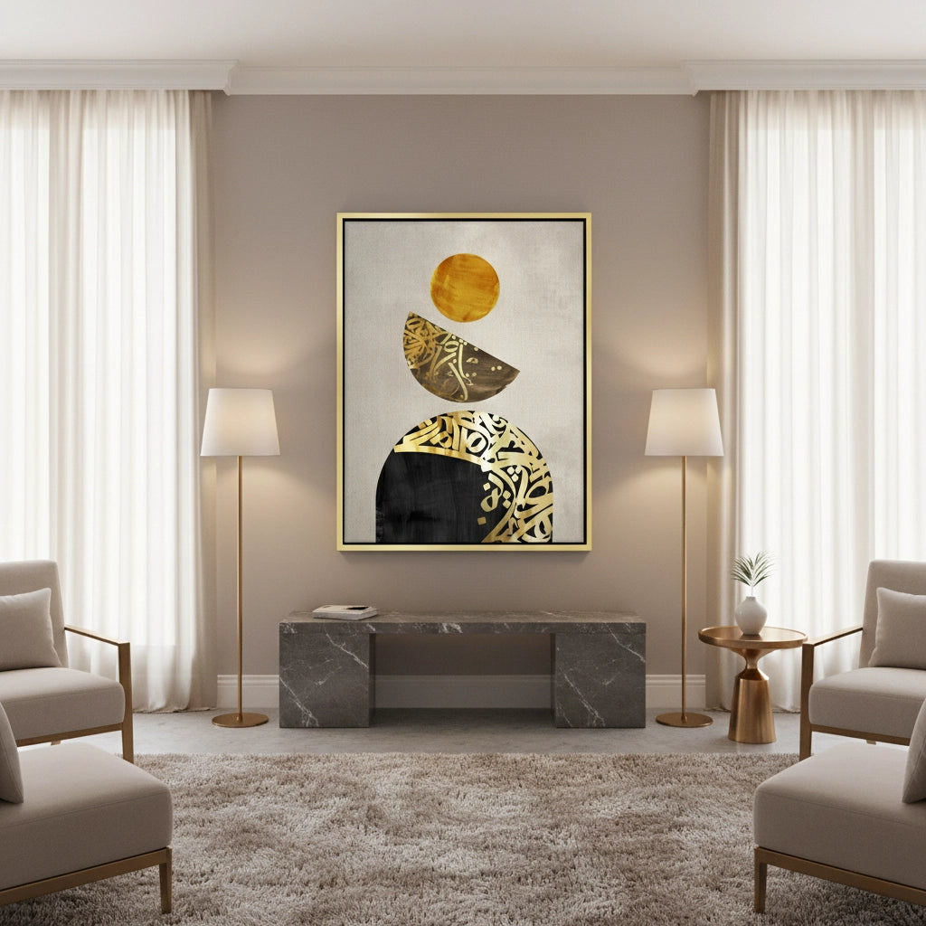 Discover spiritual balance with Boho Harmony from Jasmine Art’s Arabic Calligraphy collection. This contemporary masterpiece features a vertical stack of geometric shapes—including a golden sun and calligraphy-filled crescents—against a serene linen-textured backdrop. The blend of shimmering gold and deep black accents creates a sophisticated "Zen" aesthetic for the modern home. Finished with our signature premium vertical texture, this print offers exceptional tactile depth and a high-end gallery finish. A perfect calming centerpiece for a minimalist living room, a yoga studio, or a luxury office in Dubai.
