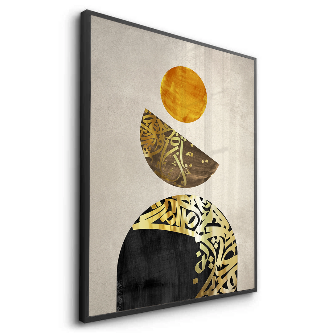 Discover spiritual balance with Boho Harmony from Jasmine Art’s Arabic Calligraphy collection. This contemporary masterpiece features a vertical stack of geometric shapes—including a golden sun and calligraphy-filled crescents—against a serene linen-textured backdrop. The blend of shimmering gold and deep black accents creates a sophisticated "Zen" aesthetic for the modern home. Finished with our signature premium vertical texture, this print offers exceptional tactile depth and a high-end gallery finish. A perfect calming centerpiece for a minimalist living room, a yoga studio, or a luxury office in Dubai.