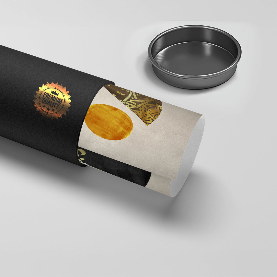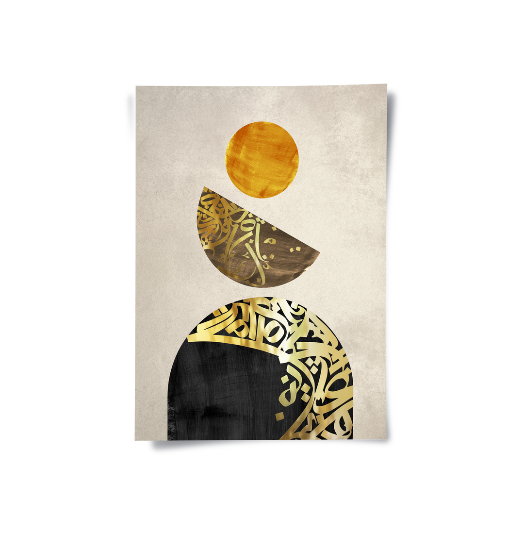 Discover spiritual balance with Boho Harmony from Jasmine Art’s Arabic Calligraphy collection. This contemporary masterpiece features a vertical stack of geometric shapes—including a golden sun and calligraphy-filled crescents—against a serene linen-textured backdrop. The blend of shimmering gold and deep black accents creates a sophisticated "Zen" aesthetic for the modern home. Finished with our signature premium vertical texture, this print offers exceptional tactile depth and a high-end gallery finish. A perfect calming centerpiece for a minimalist living room, a yoga studio, or a luxury office in Dubai.