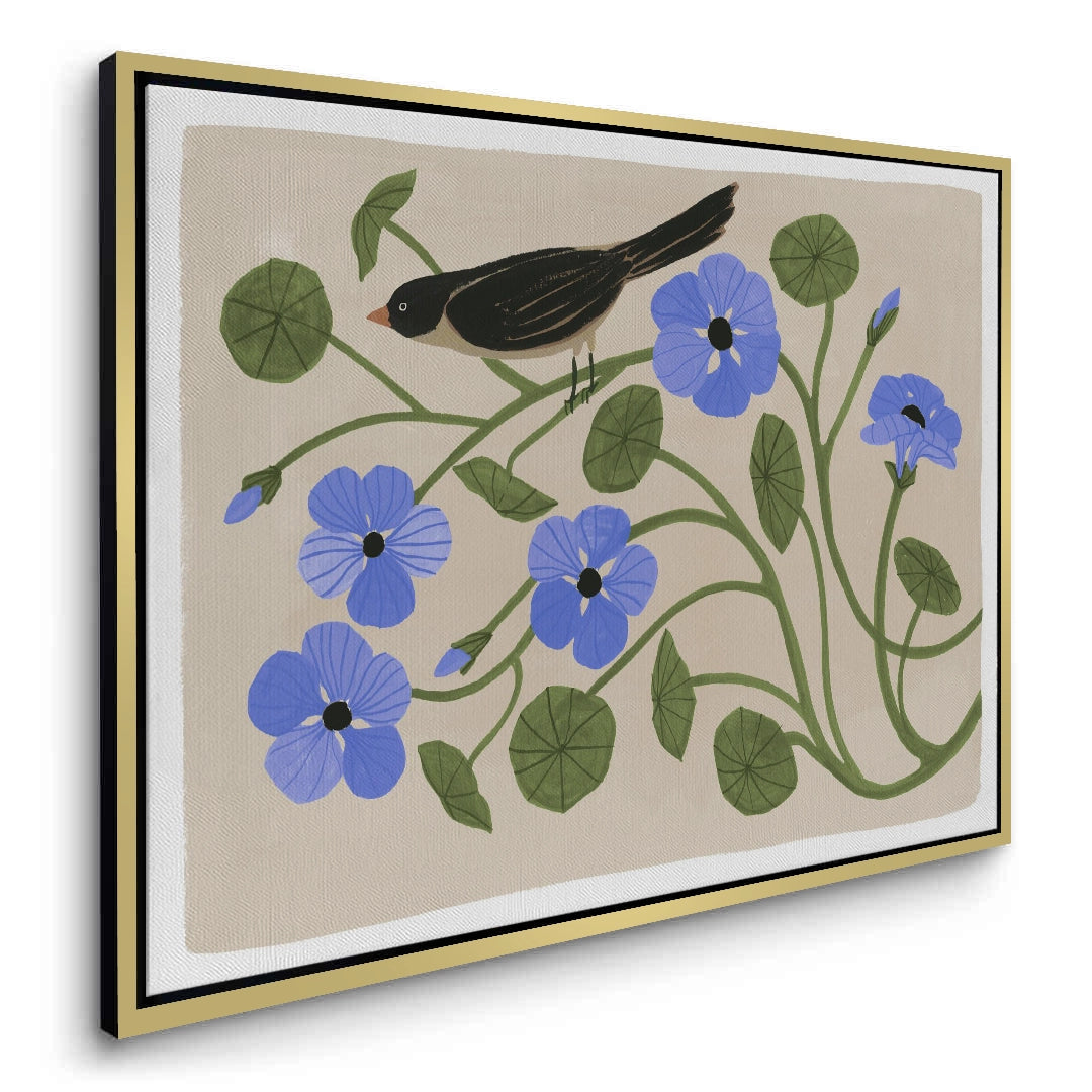 The charming Boho Bird and Blue Flower print is a delicate piece of Bohemian nature art. This canvas features beautiful, stylized blue flowers and lush green vines, with a small black bird perched peacefully on a branch. The hand-painted, organic aesthetic is set against a soothing neutral background, bringing a calm and traditional touch of nature indoors. It is perfect for creating a relaxed, welcoming atmosphere in a modern home, sunroom, or boutique in Dubai.