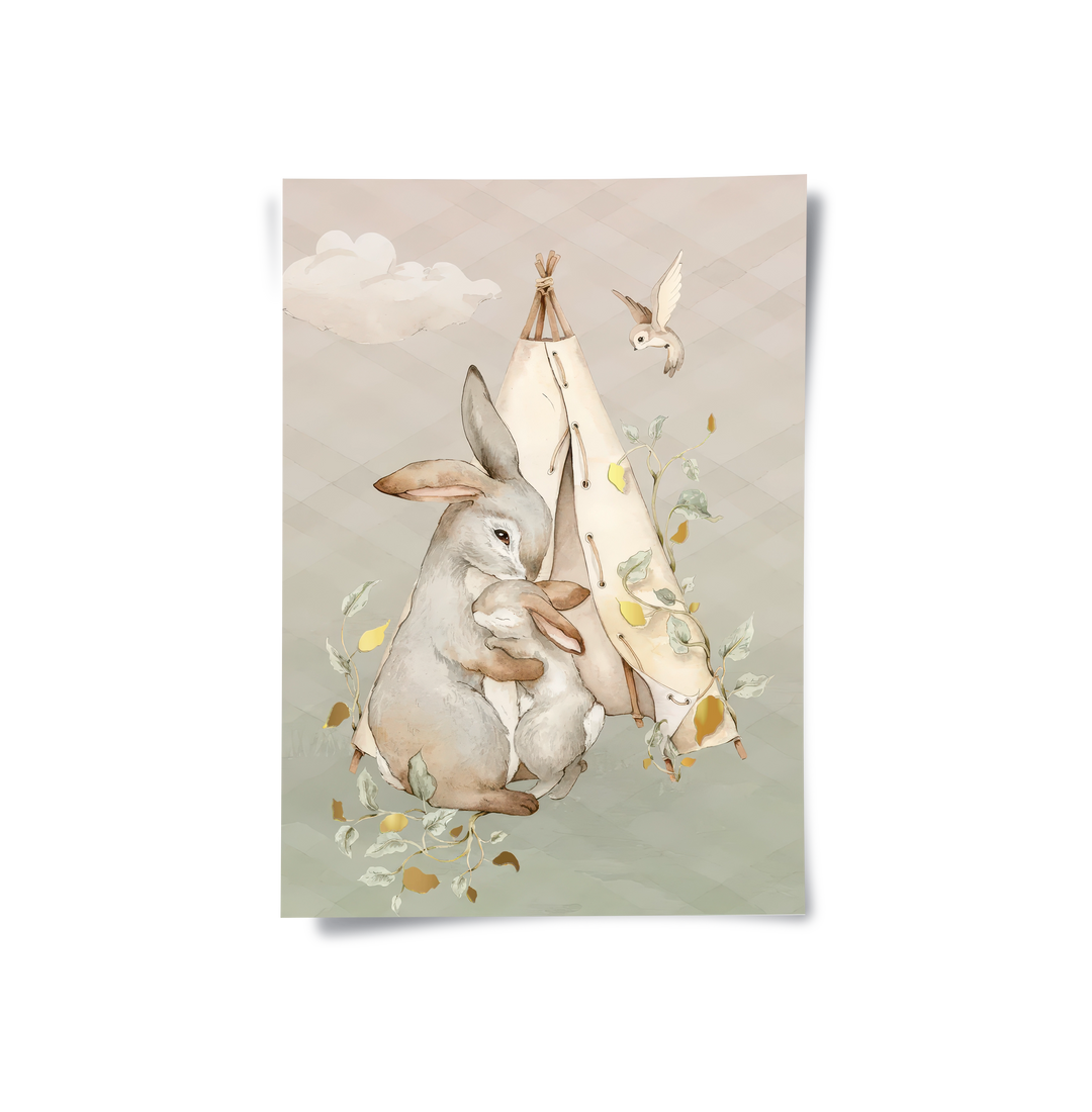 The charming Boho Bunny Love print features a sweet bunny surrounded by eclectic boho elements like feathers and subtle patterns. It brings a cozy, handcrafted touch and warmth to your child's first room.