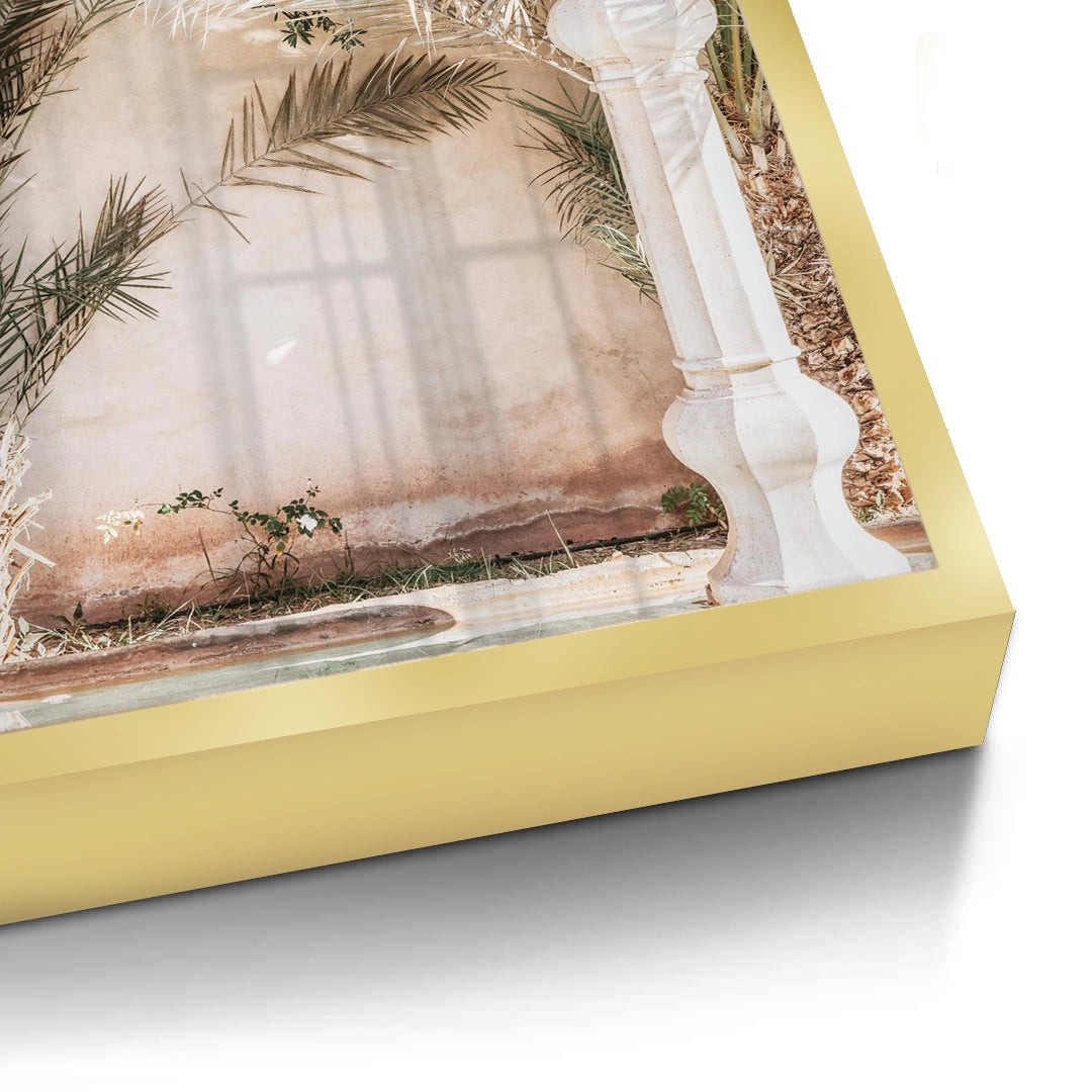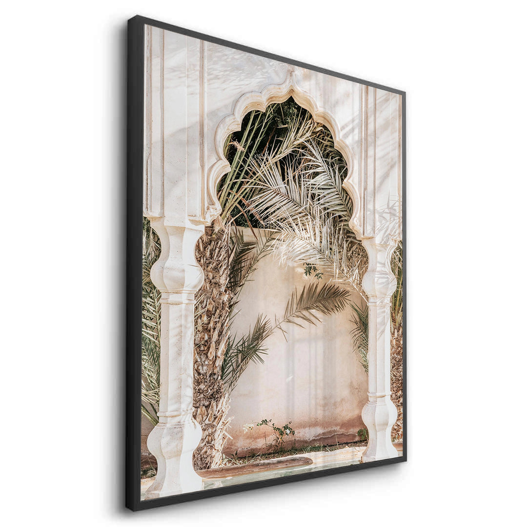 Transport your space to a sun-drenched riad with the Boho-Chic art print. This exquisite architectural piece features a beautifully carved Moroccan-style archway framed by lush palm leaves and soft, dancing shadows. The palette of warm cream and muted greens evokes the effortless elegance of Mediterranean coastal living. Finished with our signature premium vertical texture, this print offers a high-end tactile finish that adds a touch of exotic luxury to your walls. A perfect choice for a relaxed bedroom, a chic sunroom, or a modern bohemian living space in Dubai.