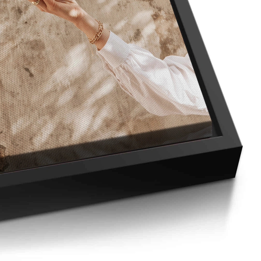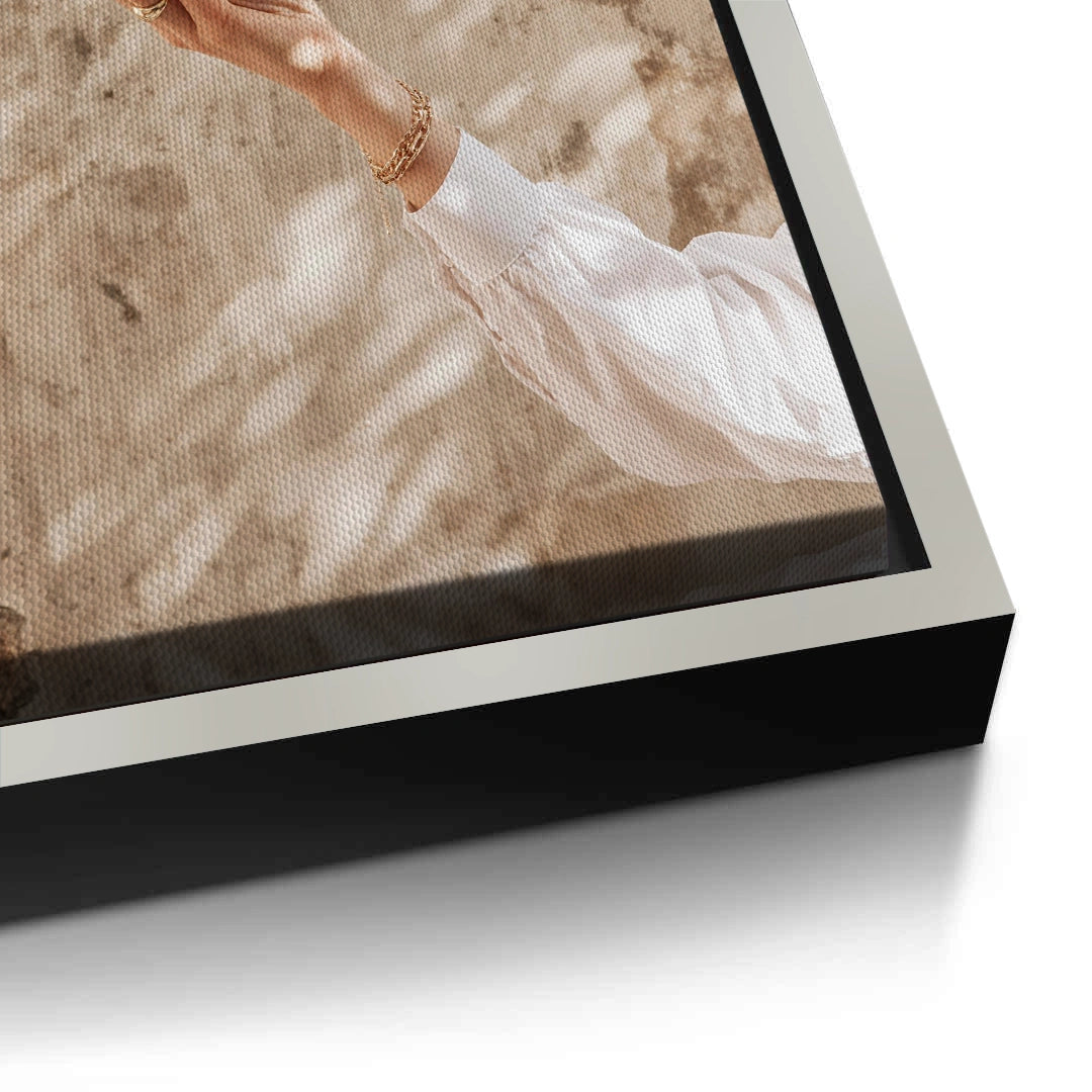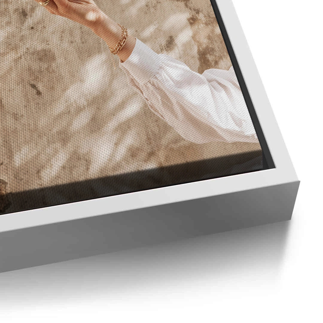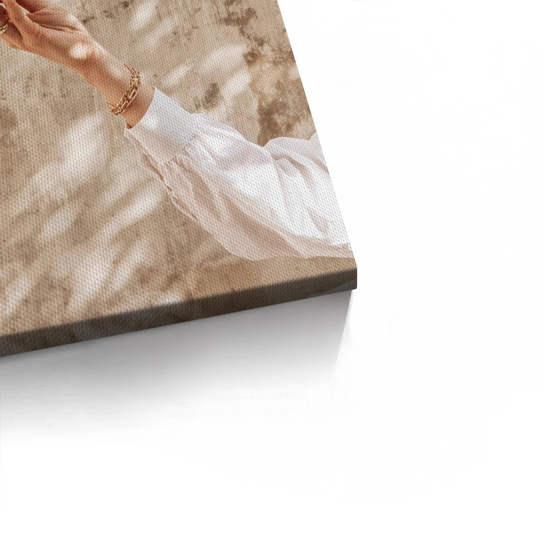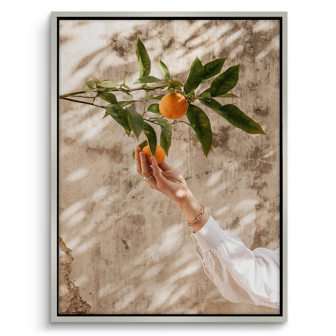 The warming Boho Citrus Branch print captures a moment of natural abundance and Mediterranean sunshine. This stylish photograph features a hand reaching for a ripe orange on a leafy branch. Set against a textured, sun-drenched beige wall with palm shadows, the artwork emphasizes the earthy colors of the fruit and the warm light. It is a perfect bohemian-inspired piece for adding freshness, warmth, and organic luxury to a kitchen or dining space in Dubai.