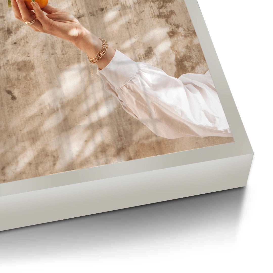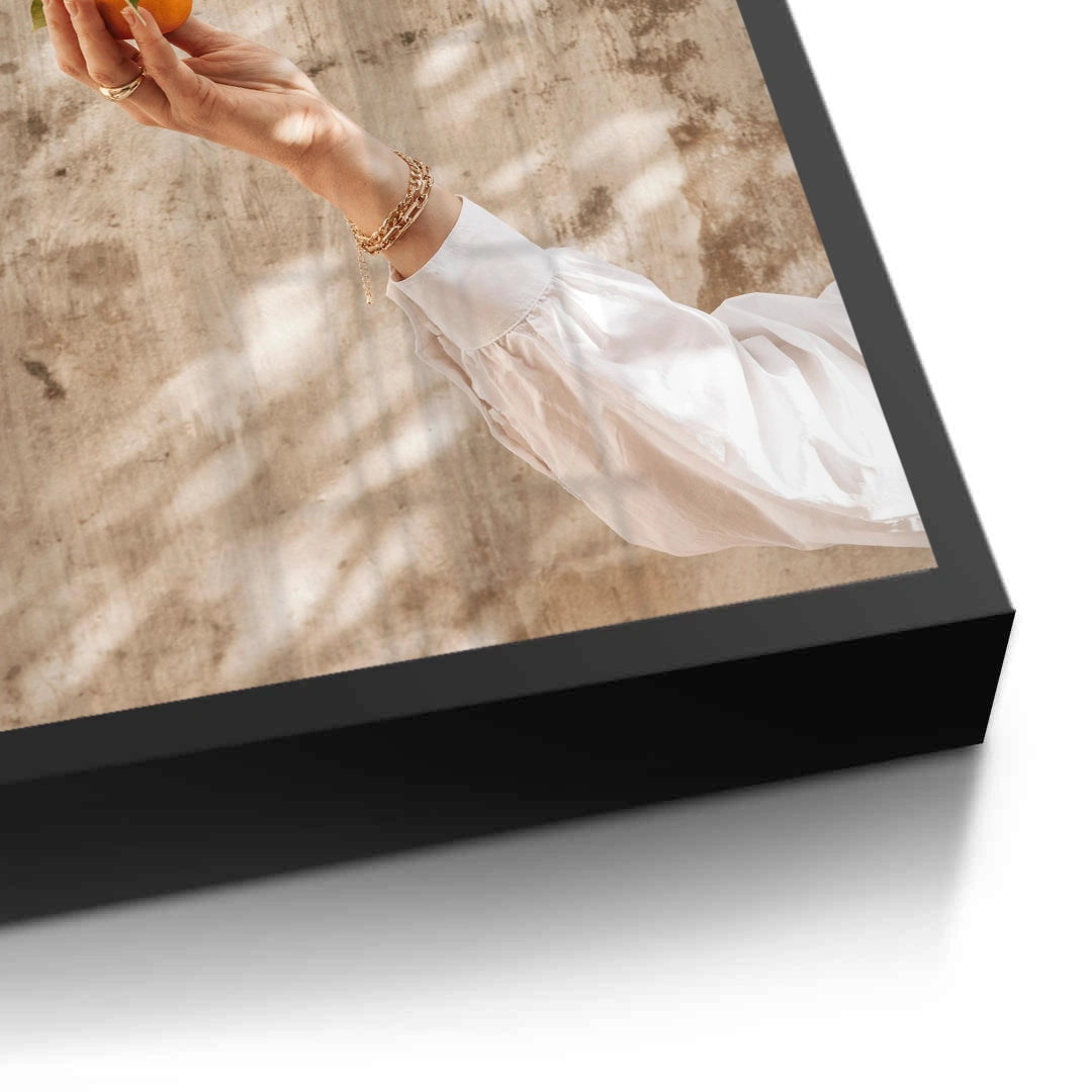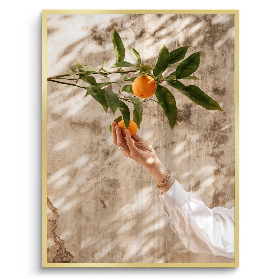 The warming Boho Citrus Branch print captures a moment of natural abundance and Mediterranean sunshine. This stylish photograph features a hand reaching for a ripe orange on a leafy branch. Set against a textured, sun-drenched beige wall with palm shadows, the artwork emphasizes the earthy colors of the fruit and the warm light. It is a perfect bohemian-inspired piece for adding freshness, warmth, and organic luxury to a kitchen or dining space in Dubai.
