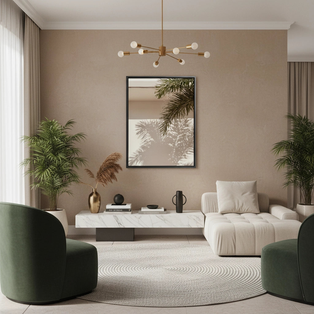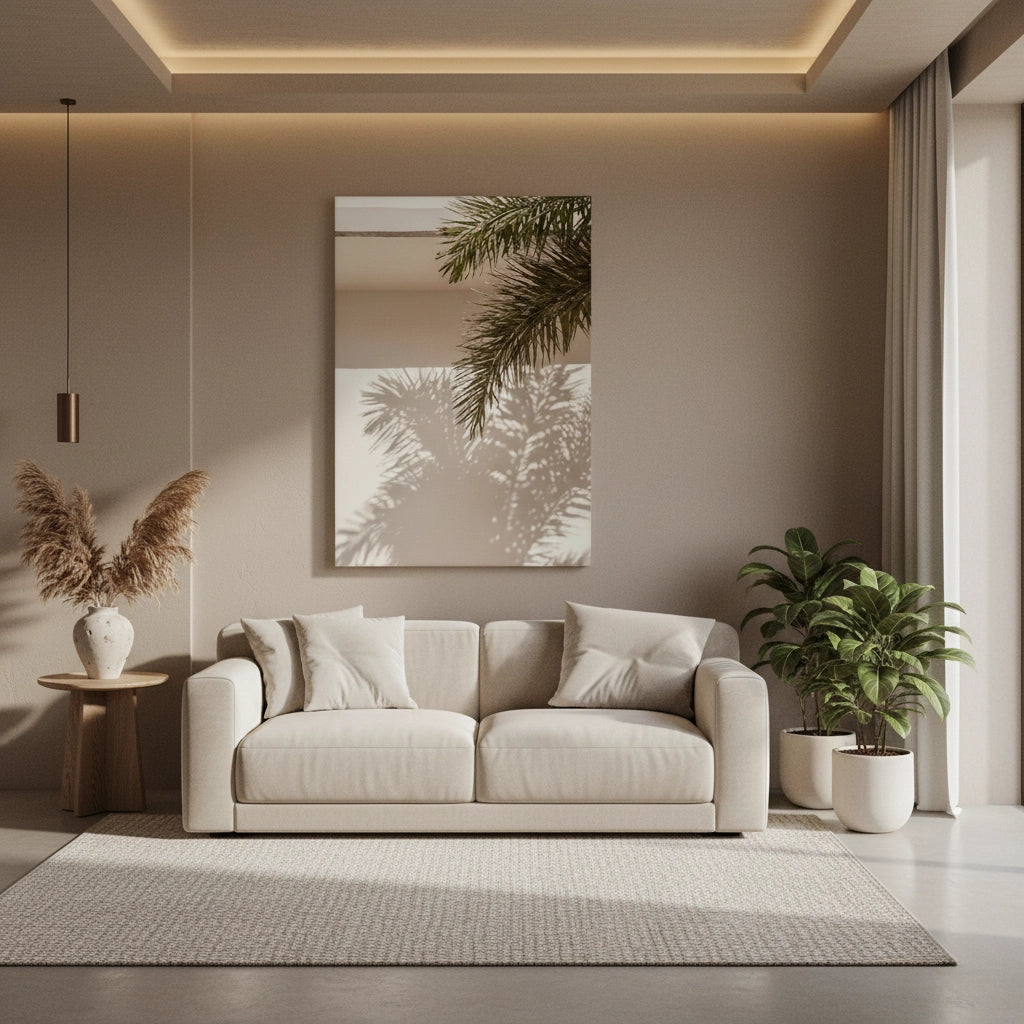 The tranquil Boho Desert Chic Palm Leaf print captures a moment of sun-drenched tropical serenity. This piece features a close-up photograph of a palm frond casting intricate shadows onto a warm, textured soft pink/beige wall. The play of natural light and shadow creates a minimalist, warm, and distinctly Bohemian atmosphere. It is an ideal piece for adding resort-style calm and desert-chic sophistication to a living space, bedroom, or entryway in Dubai.